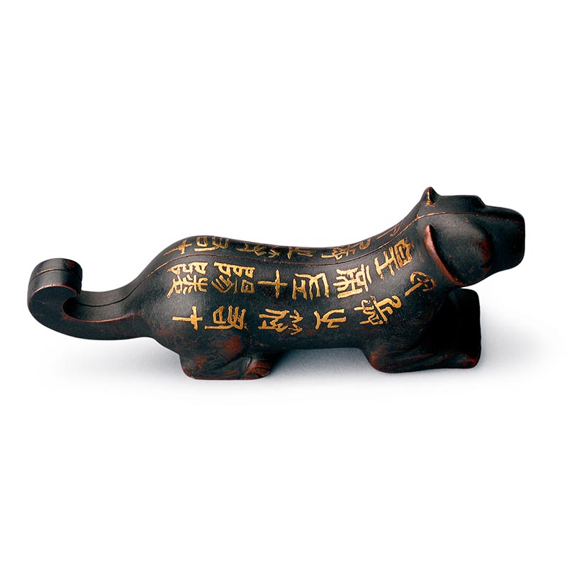 虎符高3.14厘米,长8.9厘米,相传山东省临城出土,现藏中国国家博物馆。“虎符”为古代帝王调动军队之信和物。授予地方官吏或者统兵将领以兵权,既以虎符的左半授予,待要调动军队时,即派使臣持虎符的右前往驻地。地方官吏或统兵将领两半虎符对合,验明无误,即应发兵。虎符盛行於战国、秦、汉。此件为秦代之物。虎颈至胯间左右各有错金篆书铭文两行十二字,书曰:“甲兵之符,右才(在)皇帝,左才(在)阳陵”。阳陵为秦之郡名,即今陕西高陵县。此件铜质,为秦始皇授予驻守阳陵将领之虎符。此件因年代已久,对合处生锈,现左右不能分开,整体形成一艺术品。伏虎卧地,昂首前视曲尾上翘。虎符字体谨严浑厚,风格端庄,笔法圆转,具有很高的艺术性。