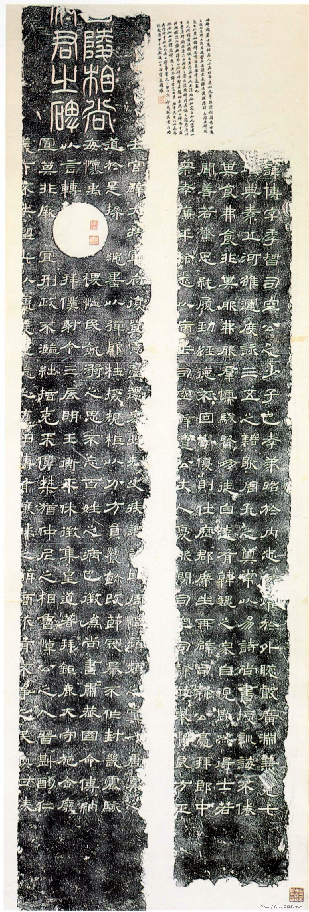 即《尚博碑》,全称《汉甘陵相尚府君碑》,又称《甘陵相碑》。隶书,碑残为两块,一块残高152cm,宽22cm,存文五行;一块残高181cm,宽24cm,存文六行,行皆三十字。无刻制年月,从字体看,当在东汉晚期。1922年洛阳市城北张羊村北陵出土,原存偃师商城博物馆,今藏河南博物院。此碑书体规整秀美,笔法雄健,字势舒展,为隶书成熟时期典型作品。