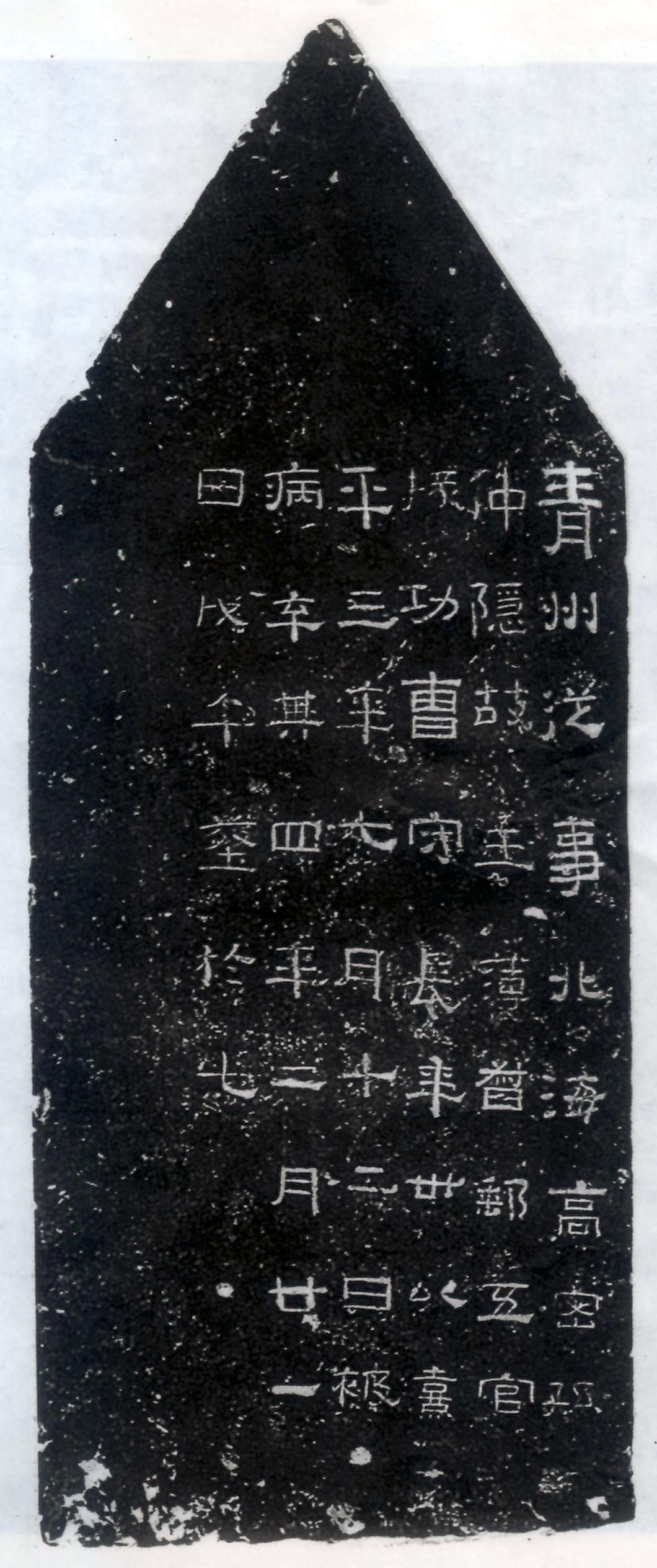 据《山东通志》所载和实地调查,《孙仲隐墓 志》出上地点,距汉高密国故城址只有五里,其西 南三里之狼埠岭,为高密国王室家族墓地。据当 地群众说:这里原有大墓十余座,一九五八年整 地时,被平去封土,作为耕地。—九七三午住王 庄村建筑场屋,利用古墓砖石,打开其中一墓,发 现有画像石门,门楣刻有羊头图案,皆浮雕,门 内墓道亦垒砌画像石。此石平置于石门内约一米 半许,圭首对向墓门,石后,置半米余高的绛色 陶马三匹。因乡民惑于迷信,未敢继续挖掘,陶 马亦未敢取出,即将墓封平。仅移出画像石三十 八条及此志,一并作为建屋之用。至一九八四年 三月,始从墙上取下此石,运至高密县文物管理 所保存。