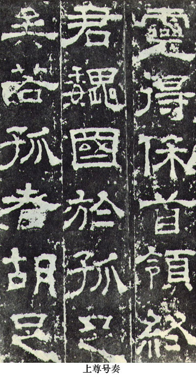 主要集中在魏国。有名的碑刻是:《上尊号奏》、《受禅表》、《孔羡碑》、《曹真碑》、《范式碑》、《王基碑》、《魏三体石经》等。一个共同特点是,出现了非常明显而且接近的程式化的作风:体势开始走向纵长;笔划形成较强的规律性,并出现了一些刻板的处理方式,像“蚕头”部分经常饰以方形的角,波磔的尾部常常过于圆满、张扬等等。这种情况,反映出在新的历史环境中,人们对于隶书的认识正逐渐趋于浅俗、简单,隶书的衰弱已经不可避免。启功先生把这时期的隶书喻为蔗渣,非常形象。可以《上尊号奏》为代表。