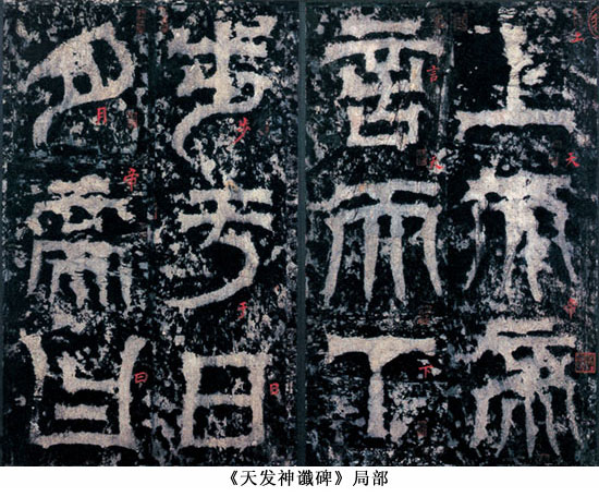 《天发神谶碑》,又名《天玺纪功碑》,传为三国吴皇象所书。晋时折为三段,俗称“三段碑”,嘉庆十年(1805)毁于火。现故宫博物院藏有北宋拓本。在中国书法史上,《天发神谶碑》是一个非常奇特的碑刻。从书体上说,它非篆非隶,处在两者之间。此碑用隶笔写篆字,横首用折刀头、横尾有波磔,竖尾用悬针,转折用方,若悬崖斩断,字势雄伟。