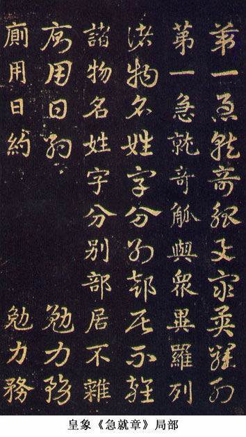 皇象,字休明,广陵江都(今江苏扬州)人。生卒不详。官侍中、青州刺史。唐张怀瓘以其八分入妙、小篆入能,章草入神品。清包世臣说:“草书唯皇象、索靖笔鼓荡而势峻密,殆右军所不及。”