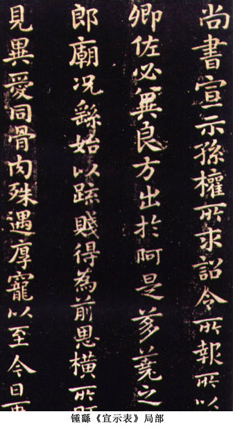 魏的书法发展比较正常,这与武帝曹操的喜爱有关,他周围聚集了锺繇、梁鹄、韦诞、邯郸淳、卫覬等一批书家。更重要的是,建安十年他还发布了一个禁碑令,虽然扼制了隶书的应用空间,但同时却可以说为楷、行书的发展提供了机遇。这一制度在东晋时得到重申,为行书发达起了极大的作用。锺繇在楷书领域的开创性贡献,为后来二王父子奠定了坚实的基础。蜀国默默无闻;而吴国则在草书、楷书和篆隶方面都有可观,尤其几块重要的碑刻已是楷书的前驱。