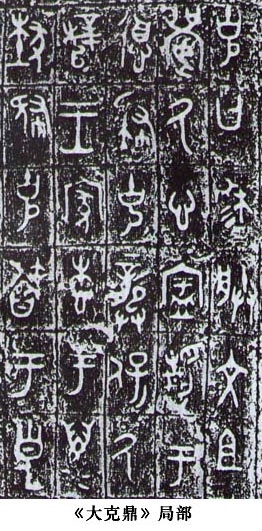 《大克鼎》,铭文二十八行,二百九十字,字迹特大,结体修长峻拔而具端穆之致。由于铭排列于界格之中,书风乃由自然而趋于整饬,是金文中的皇皇巨著。