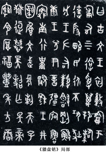 宣王时的《虢季子白盘铭》是西周晚期传世最大的青铜器,长方形,长一百三十点二厘米,宽八十二点七厘米,高四十一点三厘米。清道光年间出土于陕西宝鸡虢川司。铭文一百一十字。记述虢季子白奉周王命征伐西北强族有所虏获,受赏于周庙的事情。此盘字迹出于大篆而不尽相似,笔划纵向舒展,转折处圆劲,注意笔划之间的平行、等分关系,结体修长,上密下舒,章法散朗,全篇看去优雅清疏。论者以为实乃《石鼓文》之滥觞,由此而向小篆递进,顺理成章。近代攻篆者多取以为法。