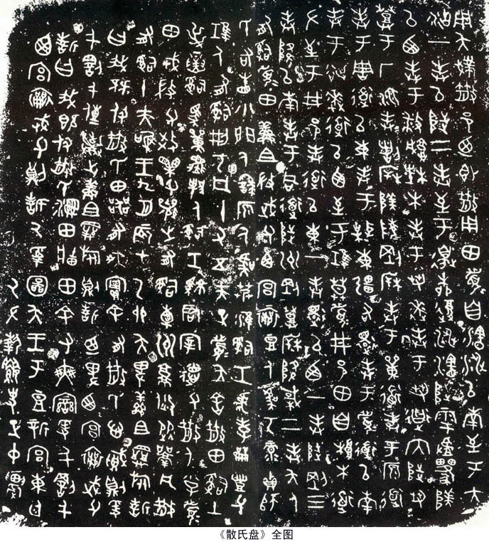 厉王时的《散氏盘》,也称《矢人盘》、《散氏鬲》,乾隆年间出土。盘腹有铭文十九行,满行十九字,计三百五十字。记述矢人将大片田地移付于散氏时所订契约,详载核定土田经界及盟誓经过,为研究西周土地制度的重要史料。其笔划一改典型金文的横平竖垂、匀稳工正,代之以欹侧斜正、粗细不一;字形取方扁之形,而且右肩似乎稍向下垂,与其它作品的长方或近方、端正稳重的体势不同,在金文中可谓别构一格。习篆籀者多取以为范。这种风格出现的原因,还有待于进一步探讨,但联系西周晚期的社会状况,不难发现,这种分化的趋势,应当是地域文化力量上升的必然反映。