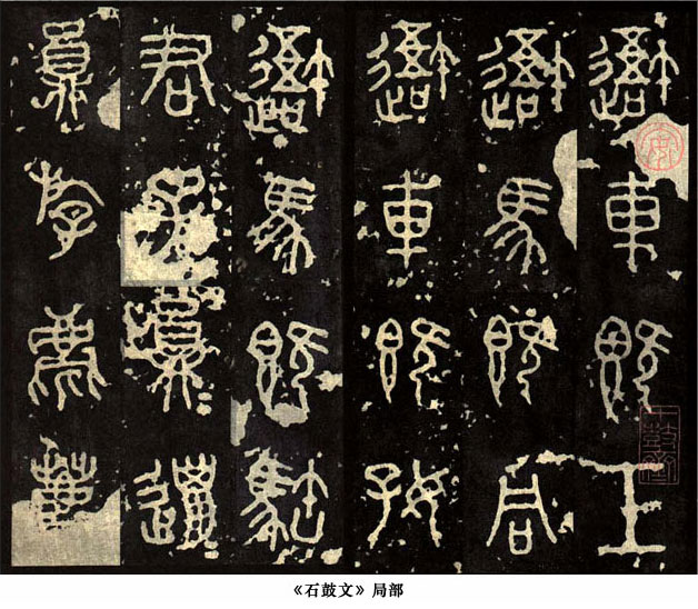 《石鼓文》,唐初发现于陕西凤翔三畤原,现藏故宫博物院。共十石,每石约一米高,其形如鼓,故通常称其“石鼓”,所刻文字为“石鼓文”。文为四言诗,述秦国国君游猎事。其刻制时代,尚无定论,约在春秋晚期至战国早期。《石鼓文》是大篆向小篆演进过程中的重要资料。其字犹存大篆典型,但笔划趋于均匀,体势趋于方整,已有小篆风度。因系原石,历来受到宝爱,由唐至今,每视为国宝,咏赞极多。师法者或强调其大篆气息,求其高古,或取小篆之意参之,得其匀稳端重,左右逢源皆得如意。