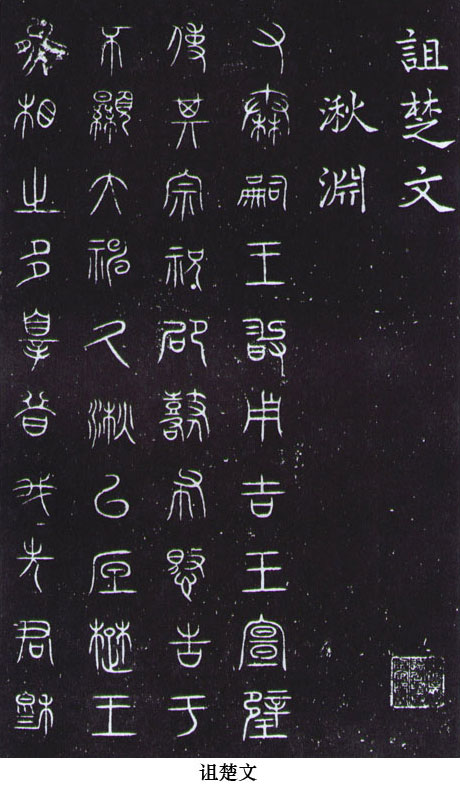 《诅楚文》,战国中期以后秦石刻,内容为秦王祀神制克楚兵复其边域,每告一神即刻一石。原石早佚,传宋代先后发现:㈠嘉祐年间凤翔开元寺出土的《巫咸文》,宋徽宗时取归御府,共三百二十六字。㈡治平中发现的《大沈久湫文》,共三百一十八字。㈢蔡挺所得,后藏洛阳刘忱家的《亚驼文》,共三百二十五字。原石宋时亡佚,所传拓本都系翻刻。现存摹刻在《绛帖》和《汝帖》上的是前两种,已失原形,不过骨架犹存,可以看出与小篆的渊源。