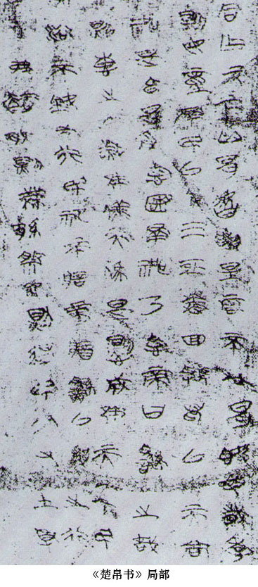楚帛书的文字具有典型的楚地地方特色,起收笔锋运用的变化不大,笔划呈弧形而且倾斜,富有动感;字形多取扁势、侧势,有一种自然随意的效果。