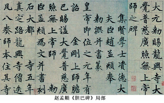 赵孟頫的大楷主要有《胆巴碑》、《三门记》等。他吸收众家之长,又参以李北海笔意,辅以行草笔法,因而庄重而不失流媚,严谨而富于生机,是大楷书的新进展。