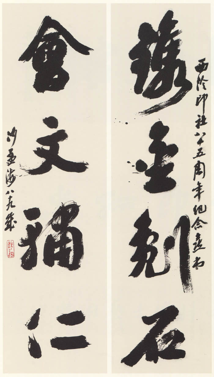 沙孟海《西泠印社八十五周年镌金会文四言联》93×24cm×2 1988年 释文:镌金劖石,会文辅仁。 款署:西泠印社八十五周年喜书,沙孟海八十九岁。 钤印:孟翁(押)