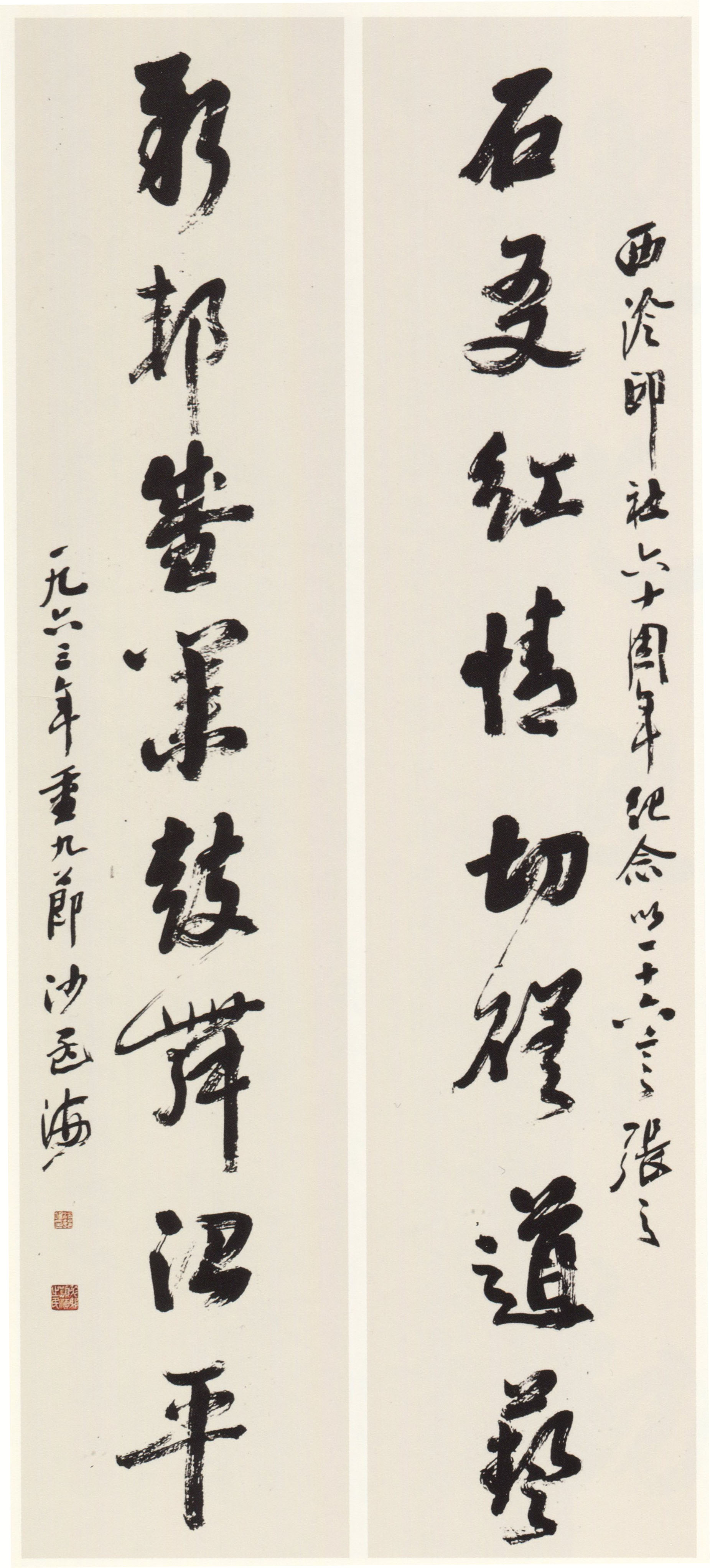 沙孟海《西泠印社六十周年纪念八言联》 124×27cm×2 1963年 释文:石友红情切磋道艺,新邦盛业鼓舞沼平。 款署:西泠印社六十周年纪念,以一十六言张之,一九六三年重九节,沙孟海。 钤印:沙邨唯印(白文)、于越频海之民(白文) 【资料来源】《沙孟海书法精品选暨纪念沙孟海诞辰115周年》(天津人民美术出版社)