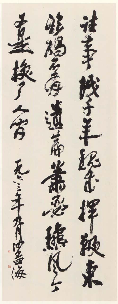 沙孟海《毛泽东浪淘沙北戴河词句轴》 120×41cm 1963年 释文:往事越千年,魏武挥鞭,东临碣石有遗篇。萧瑟秋风今又是,换了人间。 款署:一九六三年九月,沙孟海。 钤印:赤堇沙氏(白文)、凿山骨(白文) 【资料来源】《沙孟海书法精品选暨纪念沙孟海诞辰115周年》(天津人民美术出版社)
