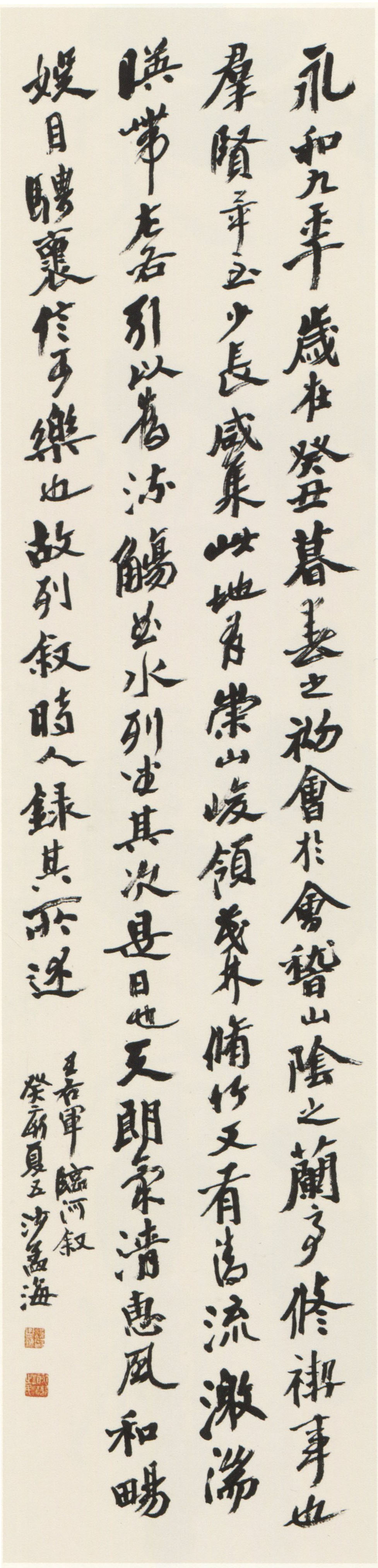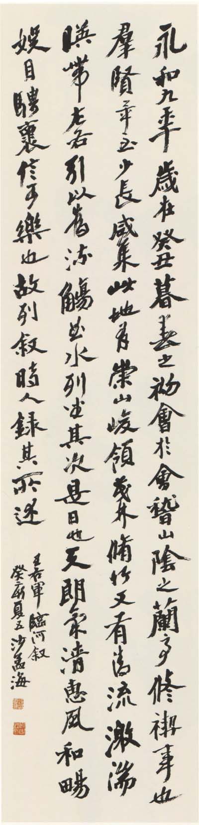 沙孟海《节录兰亭序轴》 135×32cm 1983年 释文:略 款署:王右军临河叙,癸亥夏五沙孟海。 钤印:沙孟海(朱文)、於越频海之民(白文) 【资料来源】《沙孟海书法精品选暨纪念沙孟海诞辰115周年》(天津人民美术出版社)