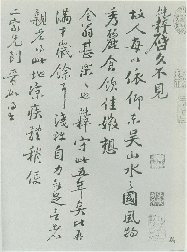 纯粹启 久不见故人 每以依仰 东吴山水之国 风物秀丽 贪饮佳媺 想全翁甚乐之也 纯粹守此五年矣 比再满才岁余耳 浅掘自力 无足言者 亲老得此地凉 疾体稍便 二家兄到晋 数得书 三家兄且安职 然去意常在也 何当款语 以纾远情 余非此可道也 纯粹上
