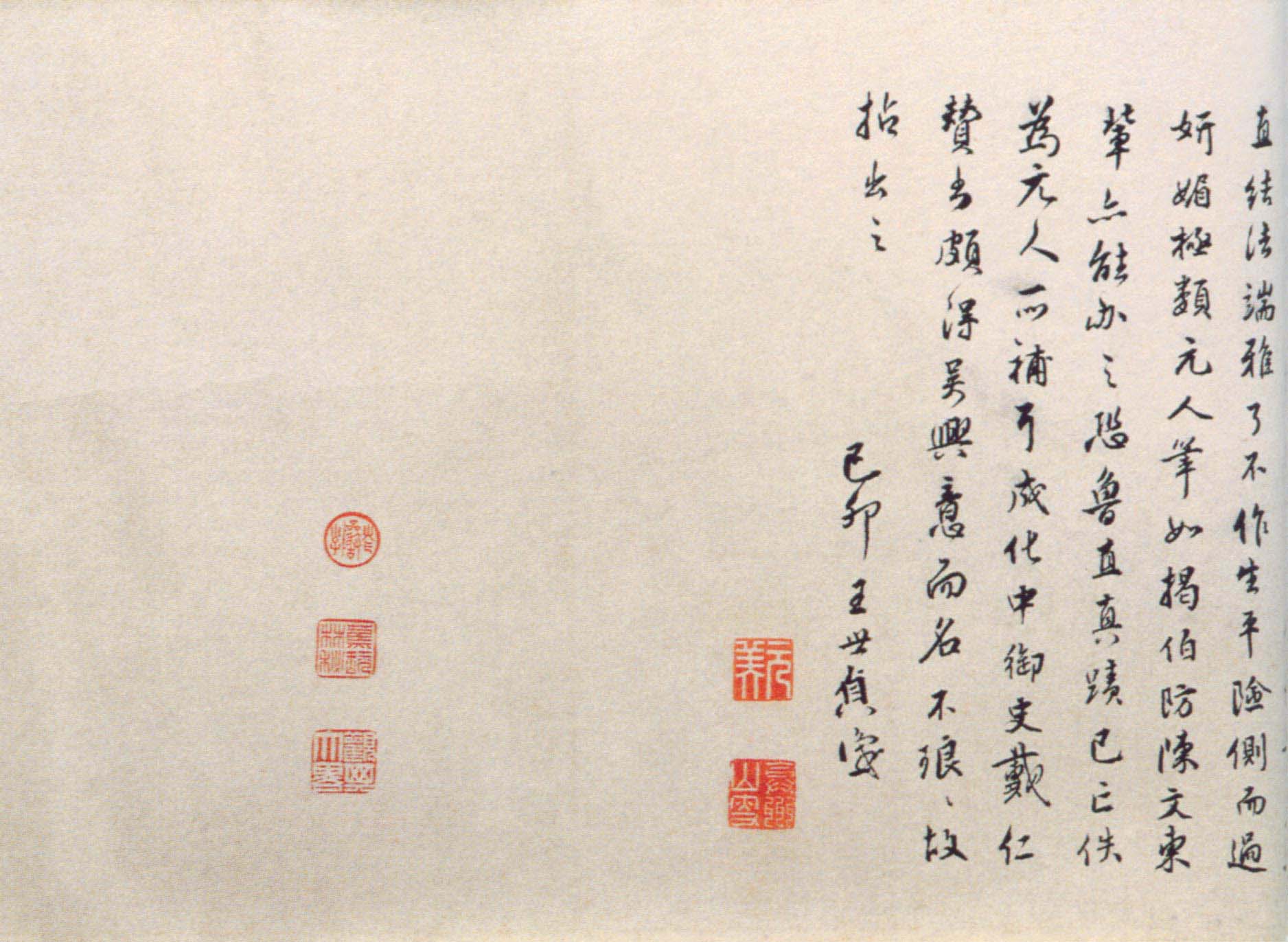 后纸有文同、吴立礼、戴蒙、柳贯、胡助、刘魁、戴仁、司马垔、吴宽等多家题跋。钤鉴藏印:“高阳图书”、“寿国公图书印”、“东汉太尉祭酒家学”、“十六世孙主奉右胜谨藏图书”、“怀州军康记”等多方,另钤清梁清标、安岐诸印,又清乾隆、嘉庆、宣统内府诸印。