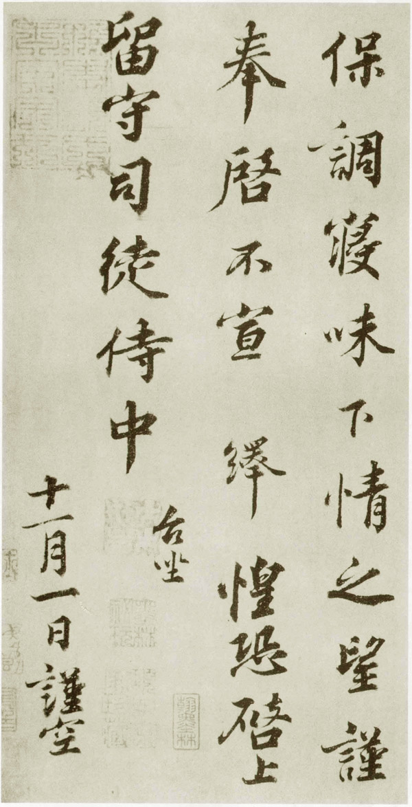 释文:绎顿首再拜 留守司徒侍中 绎瞻怀馆下 驰情旦暮 昨以承乏牵冗 久疏左右之问 悚怍至深 冬仲 严寒 伏惟台候动止万福 区区乡往 未繇言侍 仰觊 保调寝味 下情之望 谨奉启不宣 绎惶恐启上 留守司徒侍中台坐 十一月一日谨空