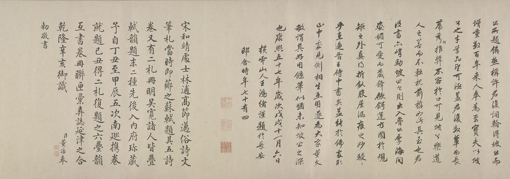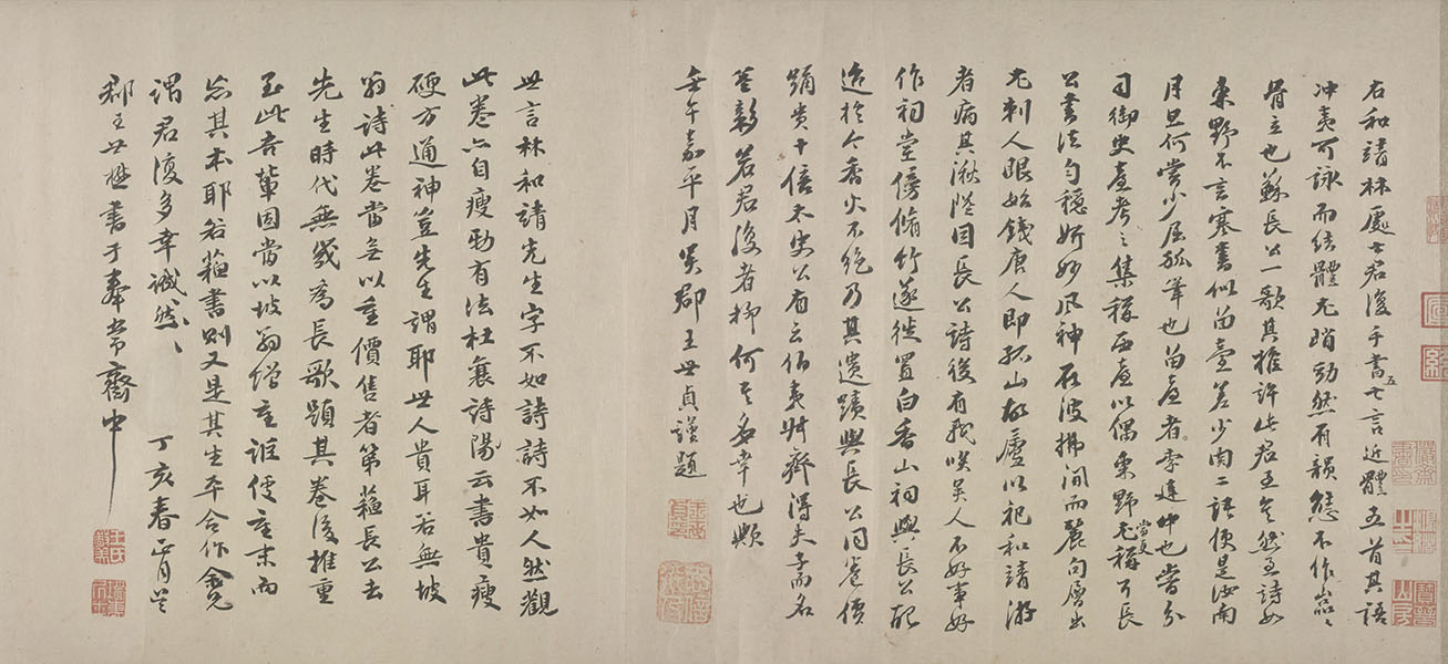 卷后有苏轼题诗书跋,七言古诗对林逋的诗,书和人品,极尽赞扬。卷中并有弘历(乾隆)四叠其韵,以及王世贞、王世懋、王鸿绪、董诰等五家十段跋,苏轼诗跋有句云:“诗如东野不言寒,书似西台差少肉。”林书确如其诗,“得梅之清”,与“疏影横斜”、“暗香浮动”之句,异曲而同工。