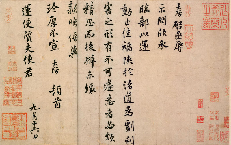 《示问帖》是吕大防传世极少的墨迹之一,是写给“运使质夫使君”的信札。“质夫”是章楶的字。上款又称“运使”、“使君”,据《宋史·章楶》本传,知其曾官成都路转运使,又江淮发运使,元祐初以龙图阁直学士知庆州。北宋时庆州属陕西路,而帖中恰又谈及治陕事,故此帖当书于是时。又考吕大防本传,“哲宗即位,招为翰林学士,权开封府”,时年约六十余岁。此帖属晚年手笔。