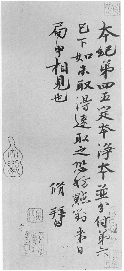 释文: 本纪第四 五定本 净本 并分付 第六已下 如未取得 速取之 恐妨点对 来日局中相见也 修拜白 脱错多 将定本卷子细对 净本候来日商量写 【资料来源】文物出版社《书法丛刊》2003年第四期