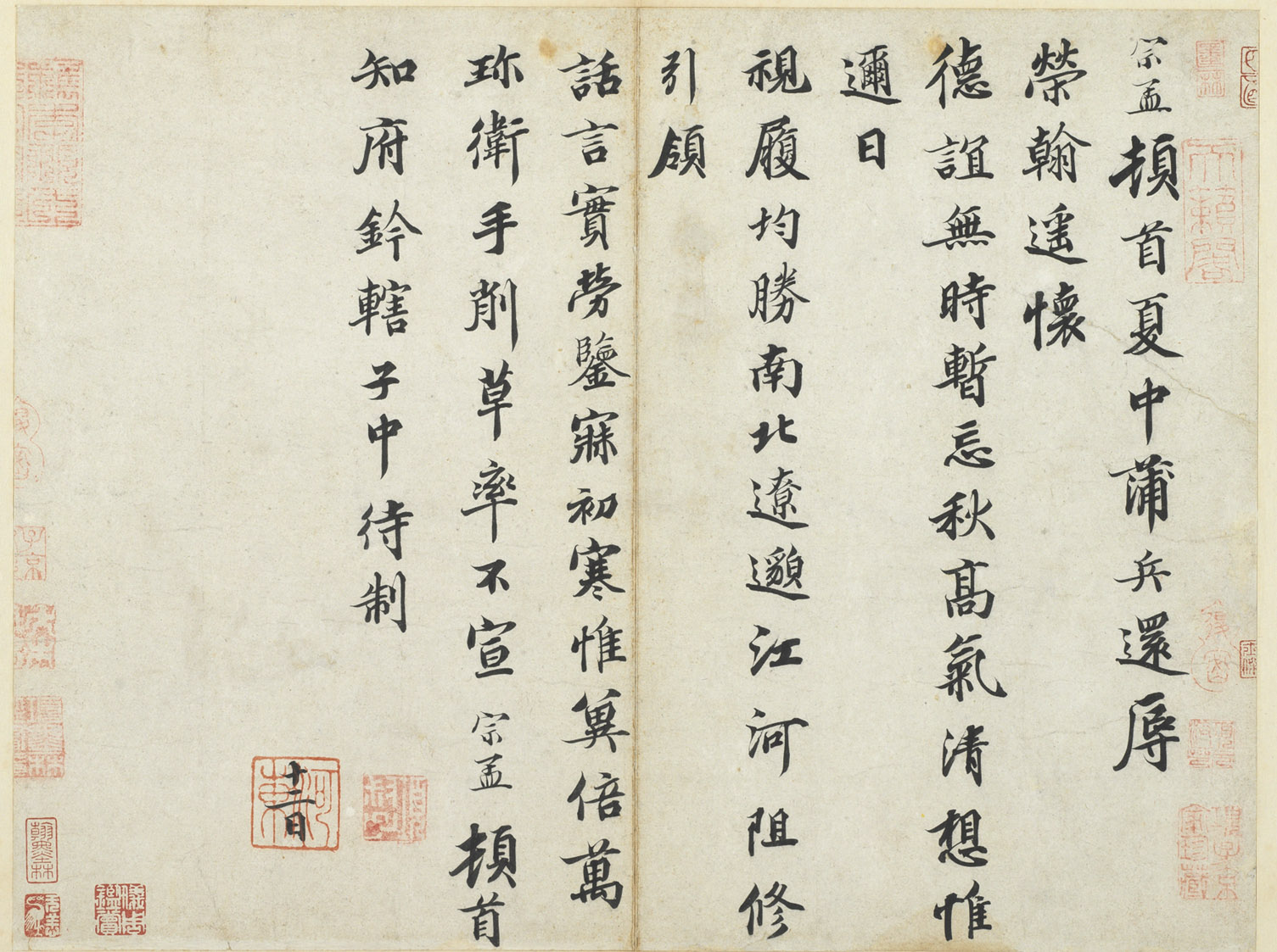 释文:宗孟顿首。夏中蒲兵还。辱荣翰。遥怀德谊。无时暂忘。秋高气清。想惟邇日视履均胜。南北辽邈。江河阻修。引领话言。实劳鉴寐。初寒惟冀倍万珍卫。手削草率。不宣。宗孟顿首。知府鈐辖子中待制。十二日。