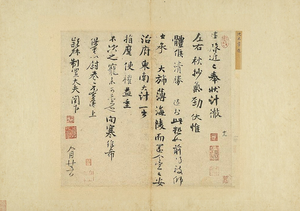 释文:遼啟。近已奉狀。計徹左右。秋杪氣勁。伏惟體候清勝。遼於此粗如前。得敦師書。承大斾薄海陵而還。今宜已安治府。東南大計。一出指麾。使權益重。不次之寵。未可量也。向寒。維希保重。以尉卷卷。不宣。遼上。穎叔制置大夫閣下。九月廿五日。