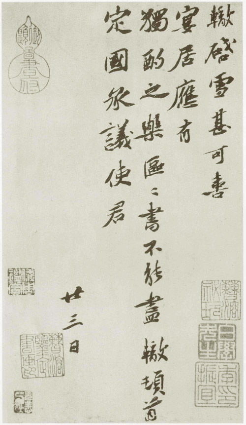 辙启 雪甚可喜 宴居应有独酌之乐 区区书不能尽 辙顿首 定国承议使君 廿三日