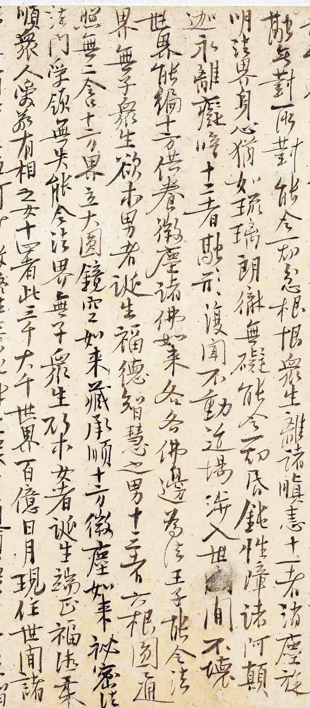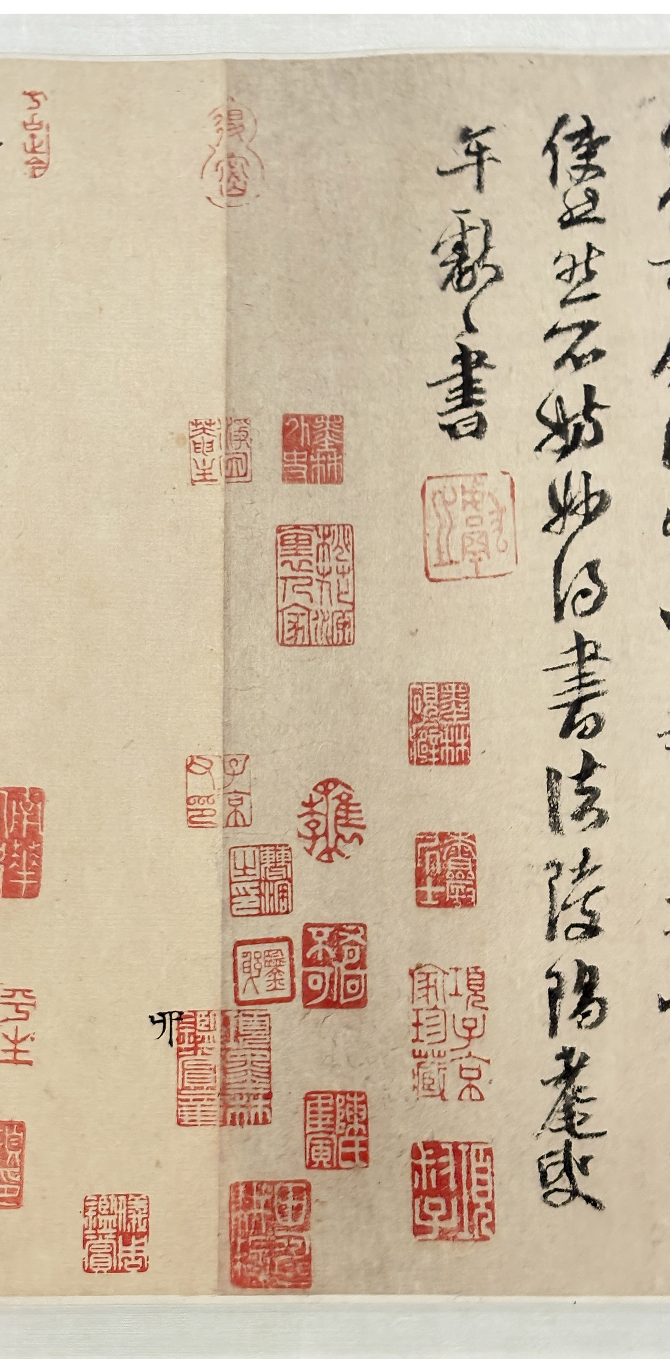 此卷于正书中间有行书,结字修长紧聚。字势于端庄中有奇纵之变,左俯右仰,上下揖让,横笔逸出,孤撇出挑,颇有奇逸之趣。全篇行次紧密,字里行间错落参差,有横雨斜风之势,萧散简远之韵。