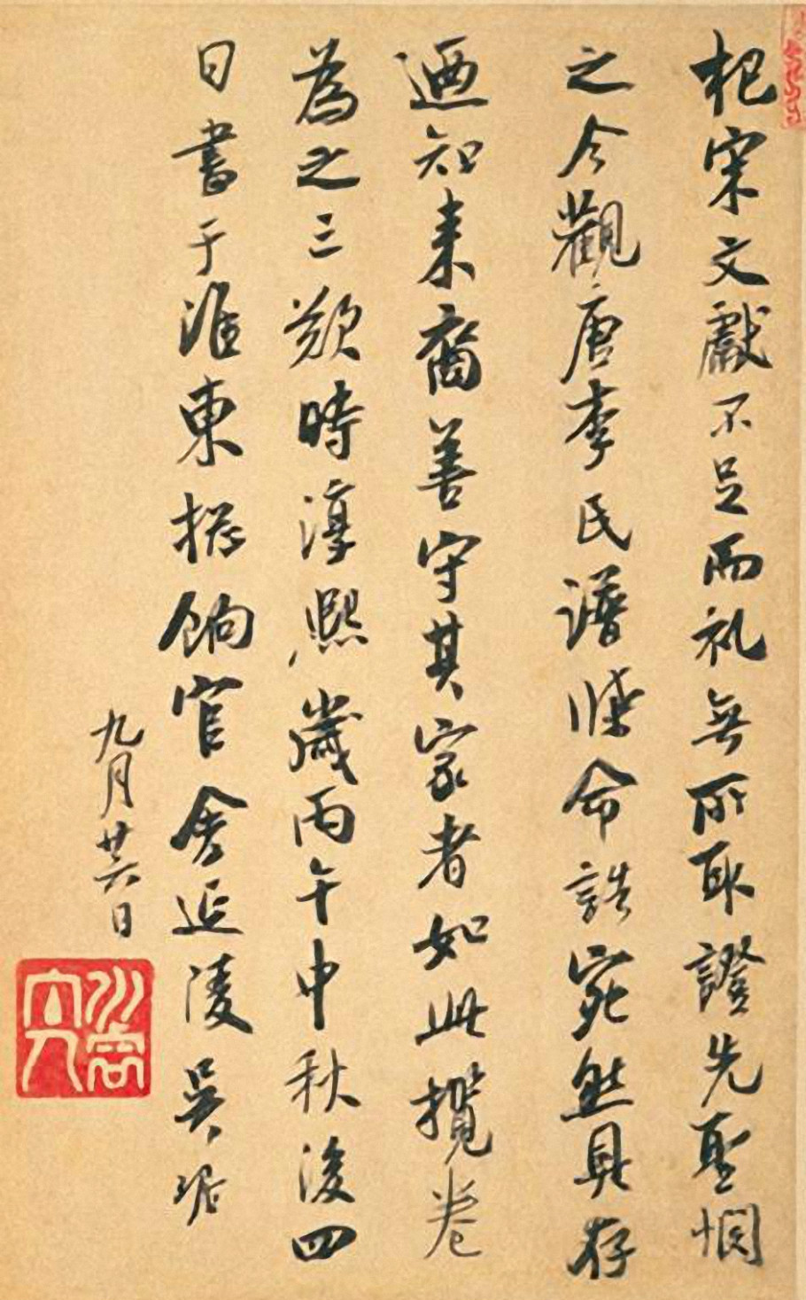 这幅书迹虽然均为小字行书,但字字写来,笔画之提顿跃动感十足,顿挫有致,墨色变化丰富。字之结体也非方正,常有偏斜体态,字态倾斜生姿,这也就是有所峻峭处的特色。整篇行气,虽然较米芾的书风含蓄,但通幅纵恣自如,也有一股潇洒意气。