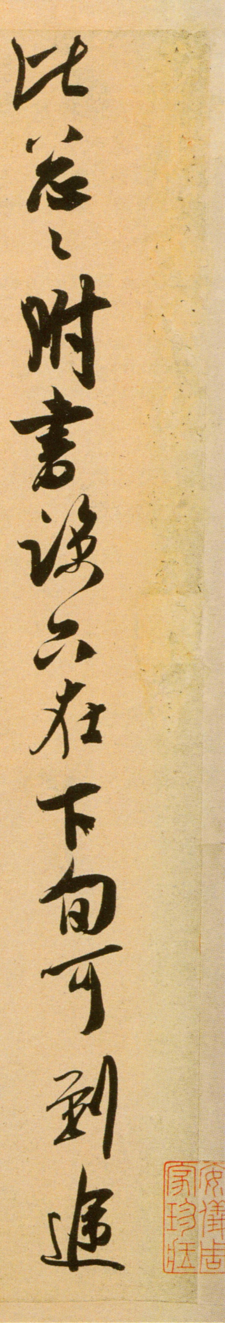 鉴藏印记:“安仪周家珍藏”(朱文)、“仪周珍藏”(朱文)· “心赏”(朱文)、“朝鲜人”(白文)、“安岐之印”(白文)等。 历代著录:《平生壮观》、《大观录》、《墨缘汇观》,刻入 《三希堂法帖》。