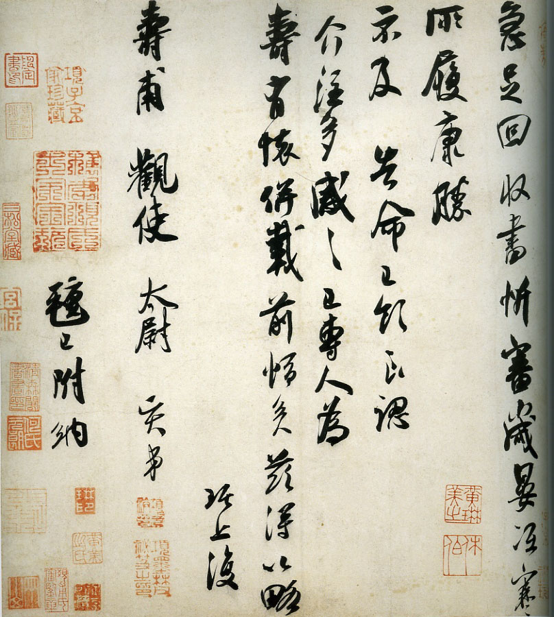 释文:急足回,收书,忻审岁晏冱寒,所履康胜。示及告命已领,至认介注,多感多感!已专人为寿,有怀并载前幅矣,兹得以略。琚上复。寿甫观使太尉贤弟。毡已附纳。