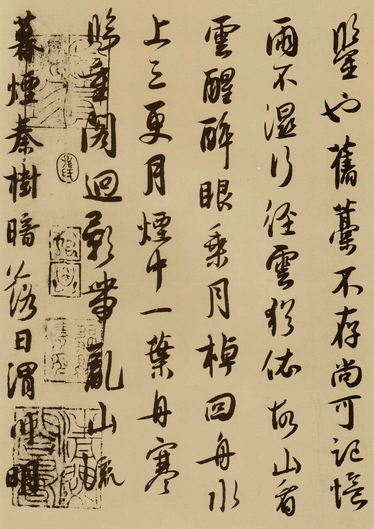 宋思陵称北宋时。唯米襄阳薛河东得晋人遗意。虞道园则谓。黄长睿有书学而笔不逮识。绍彭最佳。世遂不传。米氏父子。举世学其奇怪。弊流金朝。此卷云顶山诗帖。能以拙藏巧。上清连年帖。皆书所作得意语。波拂之际。天趣溢发。左绵帖与上清微类。而加圆熟。通泉帖咄咄逼右军。几令人有张翼叹。大抵笔多内擫。结取藏锋。妙处非乍看可了。前辈语固不虚也。道祖。襄阳同时人。尝以从官典郡。与刘涇俱好收古书画。翠微居士。其别号也。万历己卯(1579)伏日重装。世贞题。