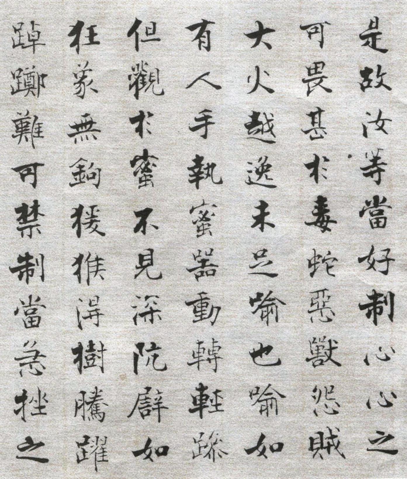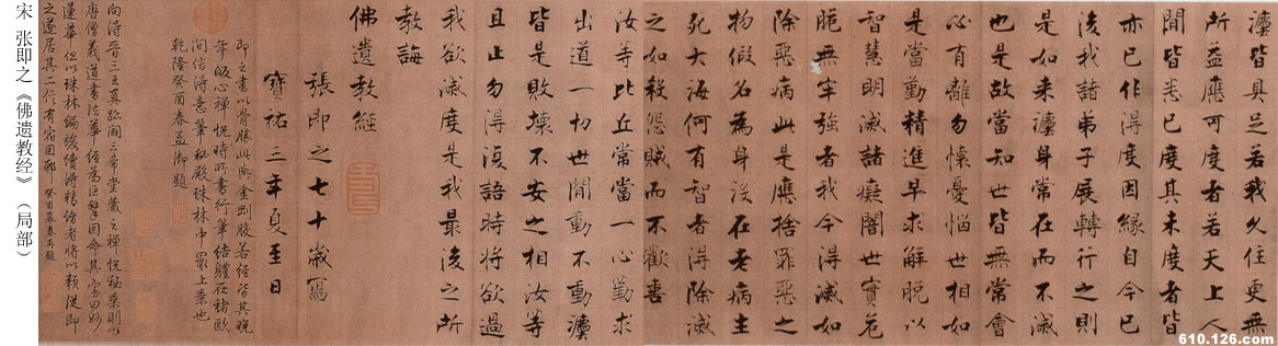 张即之《佛遗教经》,纸本行书。纵28厘米、横867.9厘米。从北宋开始,禪宗初学者入门必读“佛祖三经”,所谓“佛祖三经”指的是《四十二章经》、《佛遺教经》和《沩山警策》。此帖《佛遗教经》是张即之70岁时书,即宝佑三年(公元1255年),现藏北京故宫博物院。