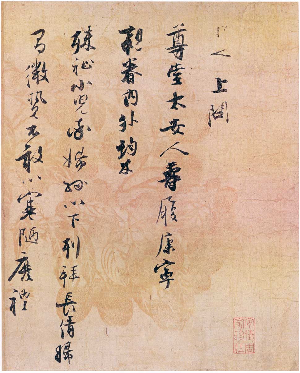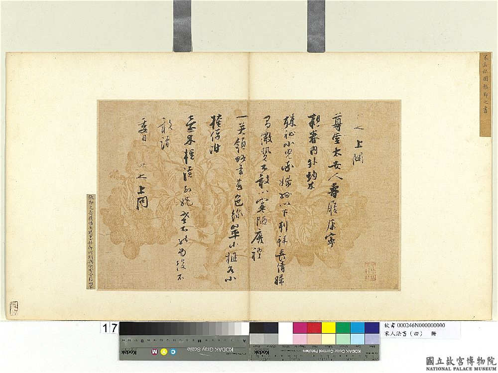 张即之《致尊堂太安人尺牍》册 纸本(牙色印花粉笺) 行书 29.5×47.2cm 台北故宫博物院藏