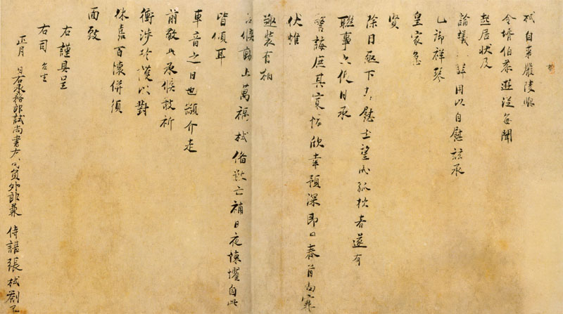 栻自來嚴陵,與令婿伯恭遊從。每聞起居狀,及論議□詳,用以自尉。茲承□禦祥琴,皇家急賢,除日亟下,甚尉士望。拭孤拙者,遂有聯事之便,日承警誨。庶其寡悔,欣幸預深。即日春首尚寒,伏惟趣裝有相,台侯動止萬福。拭備數亡補,日夜悚懼,自此皆傾耳車音之日也。顓介走前,敬此承侯。敢祈衝涉珍護,以對休嘉。百懷並須面致。右謹具呈右司台坐。正月日。右承務郎、試尚書左司員外郎、兼侍講張栻劄子。