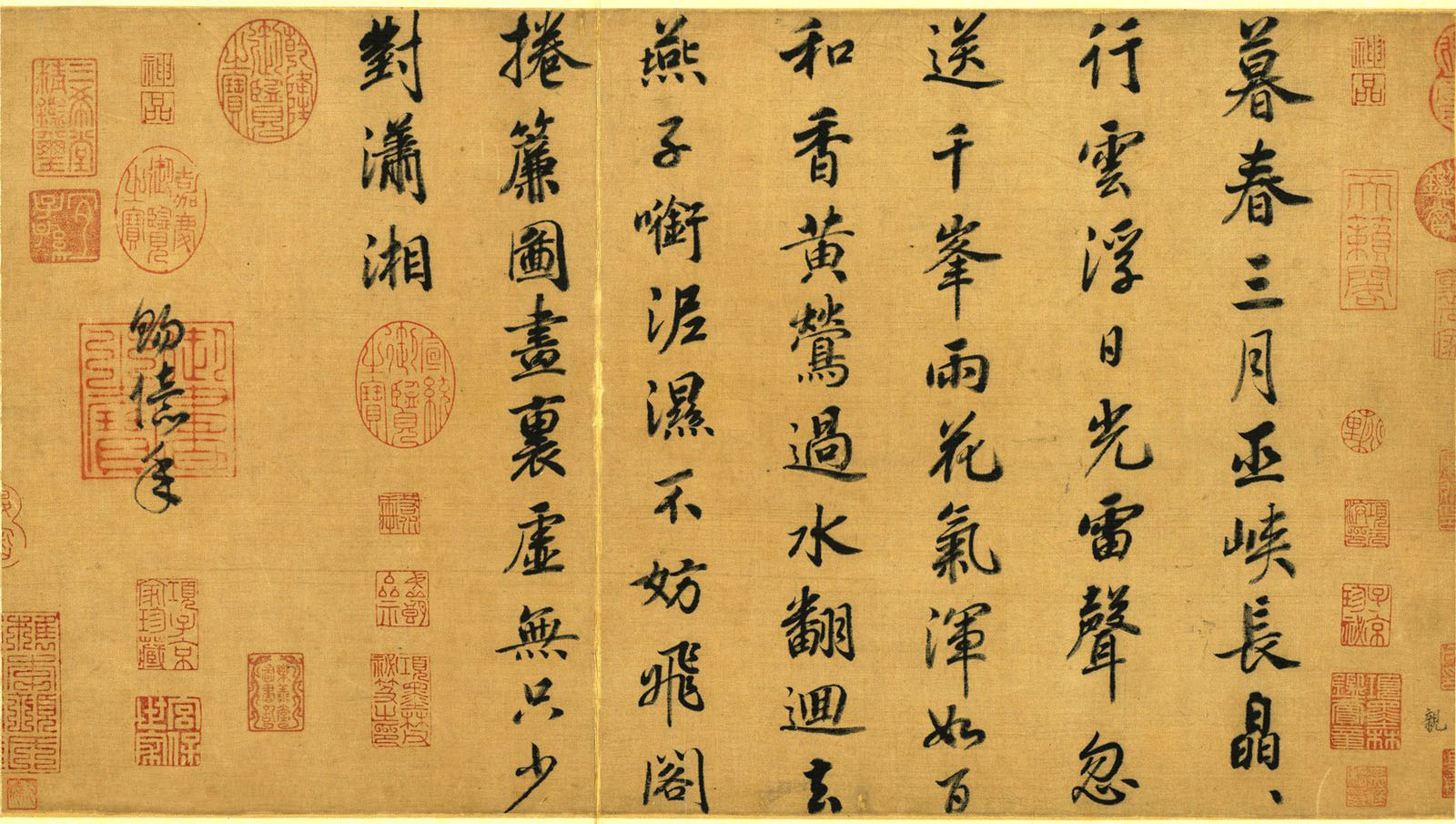 此幅墨迹是宋高宗以楷书书写杜甫的七言律诗(即事),又名「暮春三月诗帖」。此一诗帖以中锋书写,通幅看来章法疏朗,字体匀称、圆润,墨色统一,令人看来赏心悦目。杜甫这首七律的意境如画,高宗笔墨洗链,二者可说是相得益彰。诗后原来还有元代赵孟頫为此诗作的图,可惜已被人裁去。