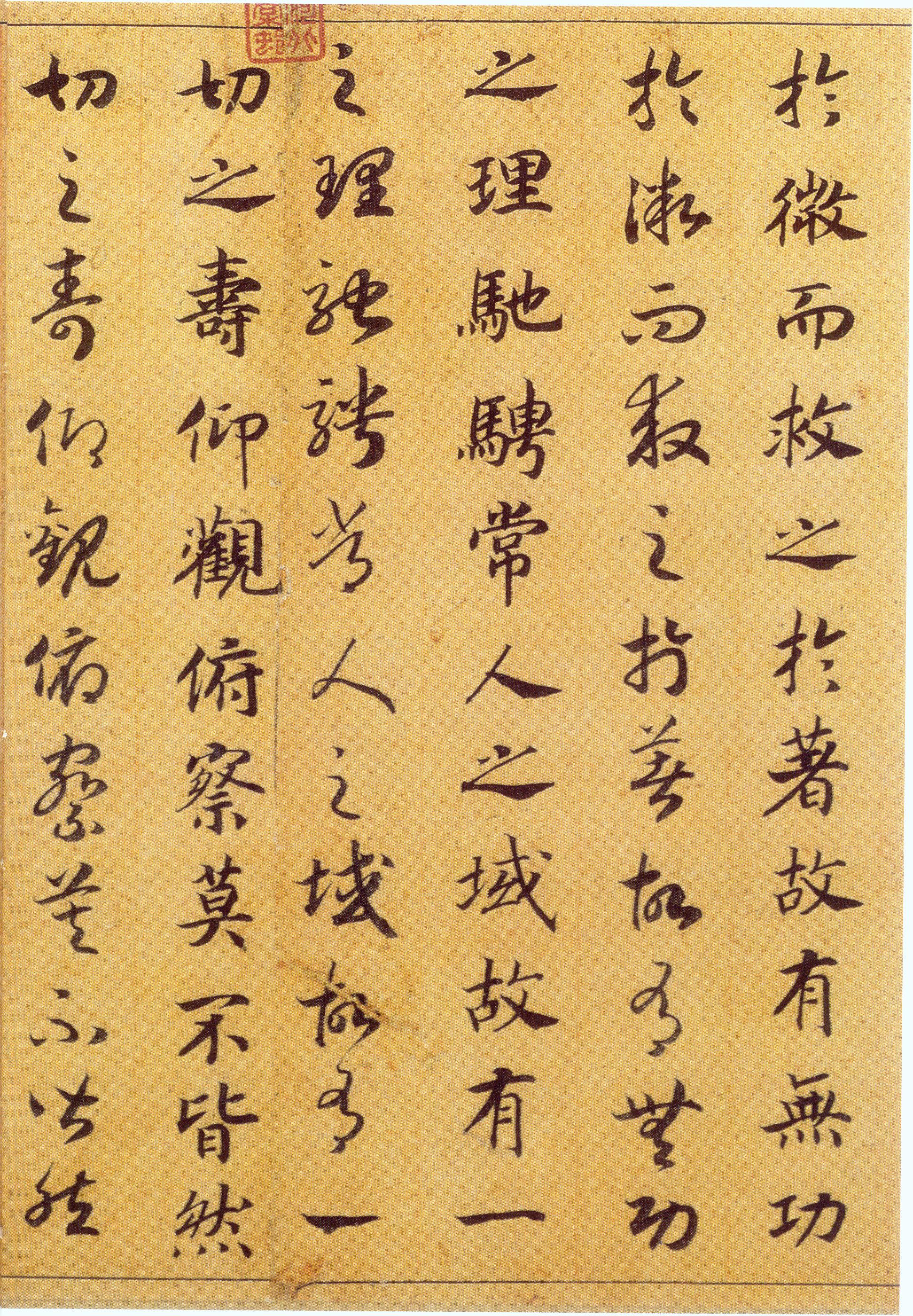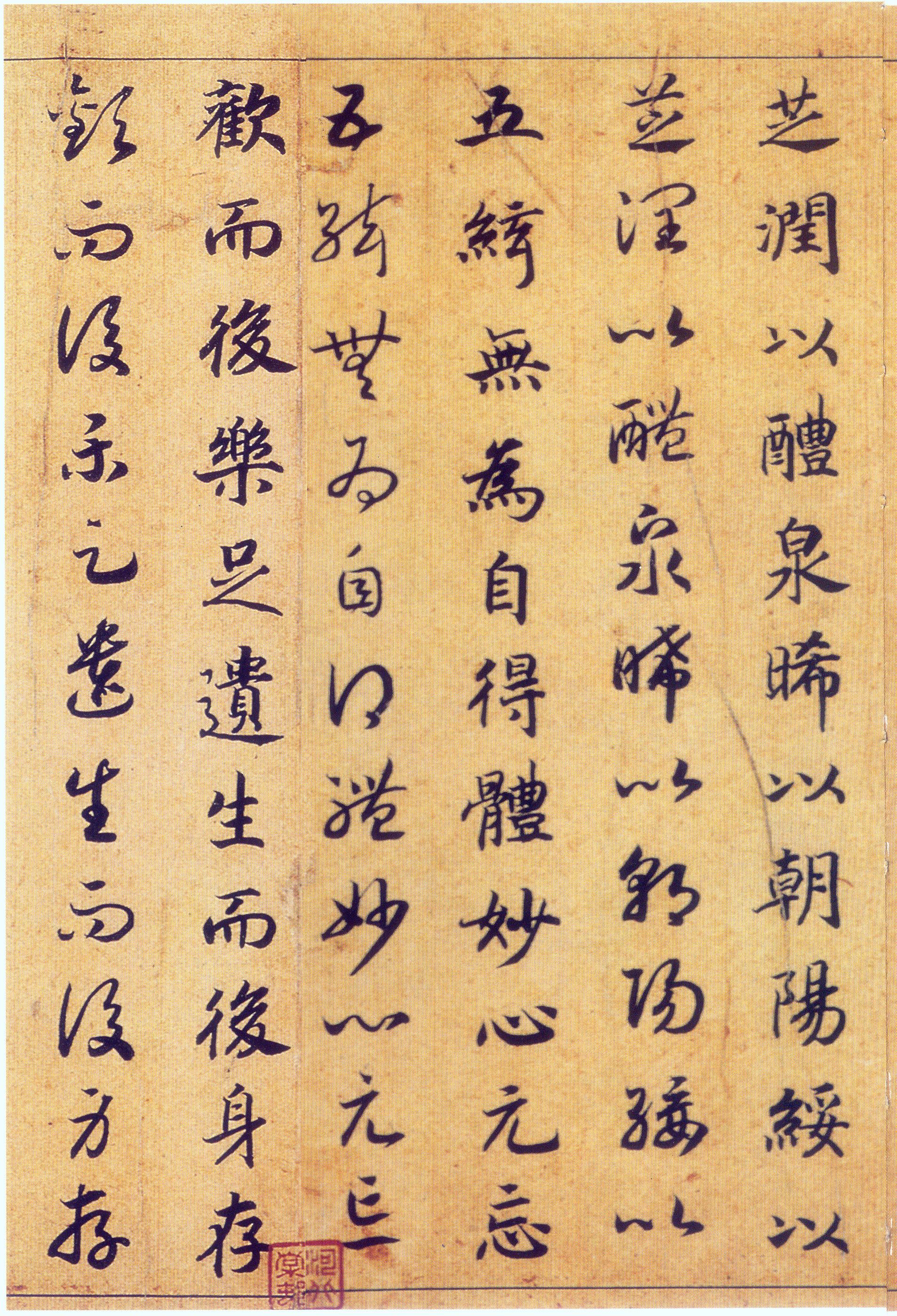 赵构此篇《养生论》,完全承传了“二王”一脉的书风,用笔润媚圆和,精奥纯正,丰腴圆润不失清逸之气,温柔妍婉颇具清和流宕之像。结字疏朗秀整,真书工稳而韵意萦绕,草书流动而意态冲和,真所谓“禊帖嫡宗”。(文/张伟生)
