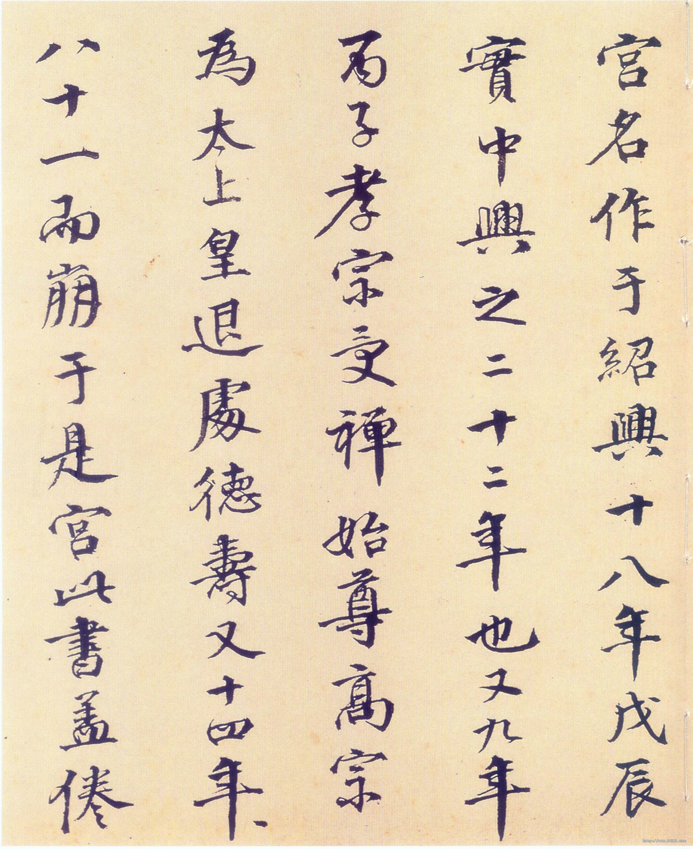 赵构作为一代偷安误国的君主,对书法艺术却情有独钟,自谓:“顷自束发,即喜揽笔作字,虽屡易典型,而心所嗜者固有在矣。凡五十年间,非大利害相妨,未始一日舍笔墨”。其书初学黄庭坚,继学米芾,后专意钟王、智永,又辅以六朝风骨,遂自成家。其云:“余自魏晋以来,至六朝笔法,无不临摹,或萧散,或枯瘦,或遒劲而不回,或秀异而特立,众体备于笔下,意简犹存于取舍,至若《褉帖》则测之益深,拟之益严,姿态横生,莫造其源,详观点画,以至成诵,不少去怀也。”
