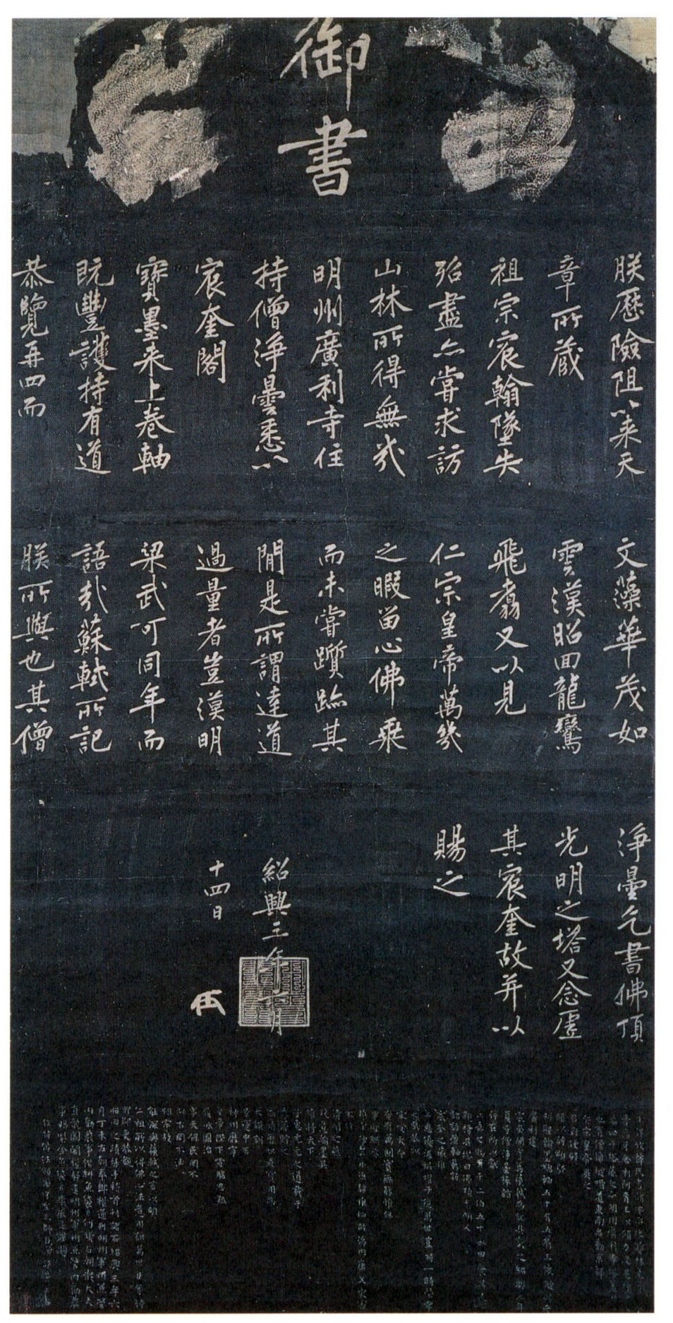 朕历险阻以来,天章所藏祖宗宸翰坠失殆尽,亦尝求访山林,所得无几。明州广利寺住持僧净昙悉以宸奎阁宝墨来上,卷轴既丰,护持有道,恭览再四,而文藻华茂,如云汉昭回,龙鸾飞翥。又以见仁宗皇帝万几之暇,留心佛乘,而未尝踬迹其间,是所谓达道过量者。岂汉明梁武可同年而语哉?苏轼所记,朕所与也,其僧净昙乞书佛顶光明之塔,又念虚其宸奎,故并以赐之。