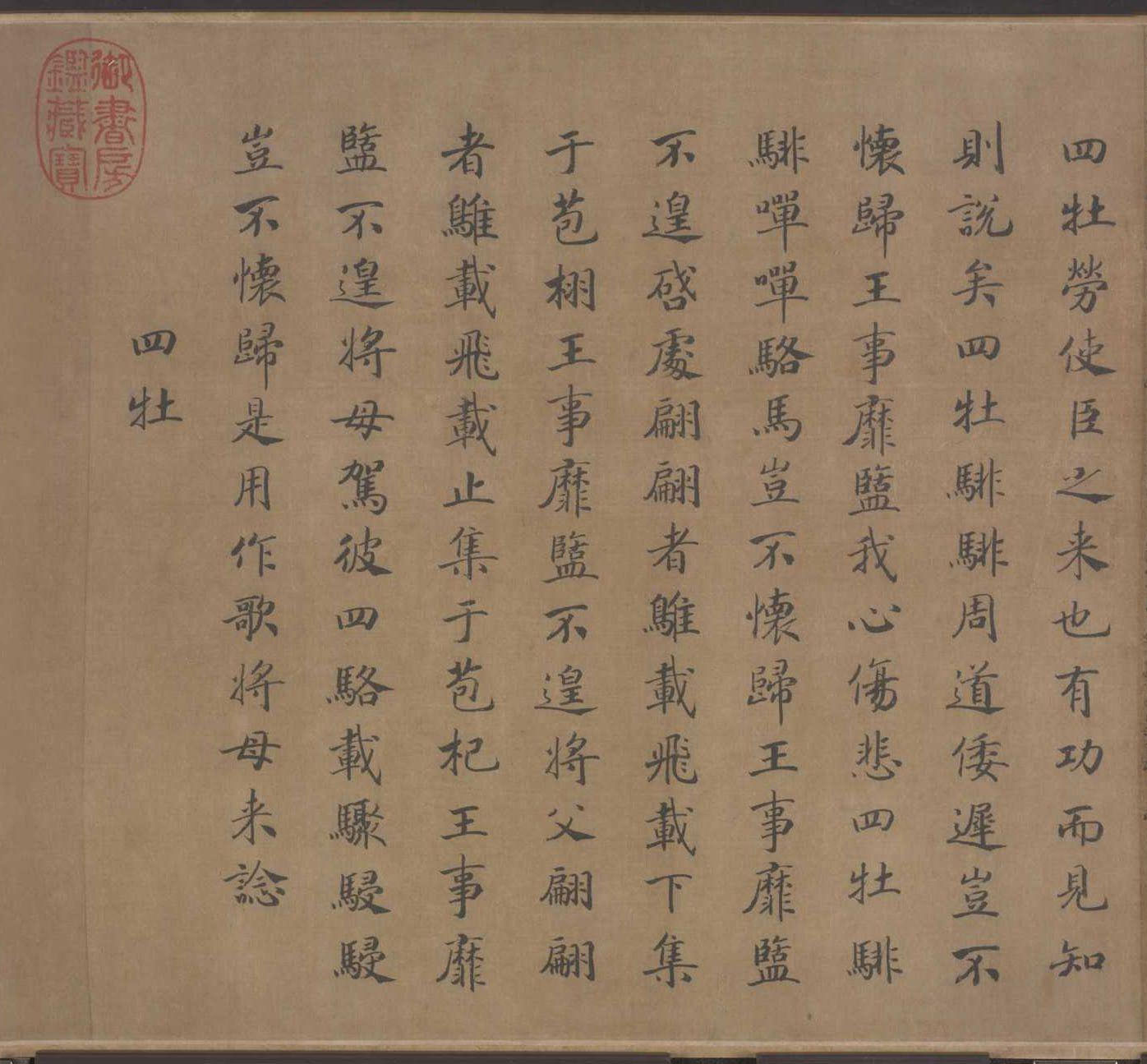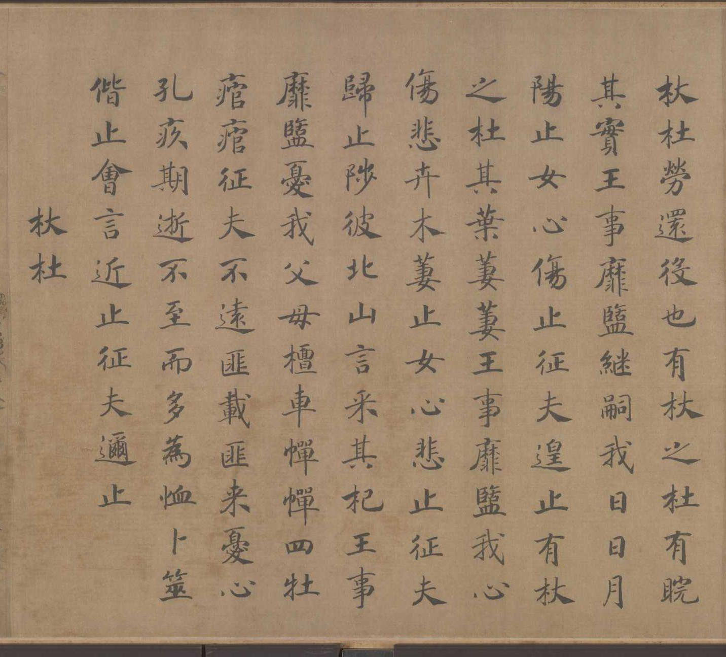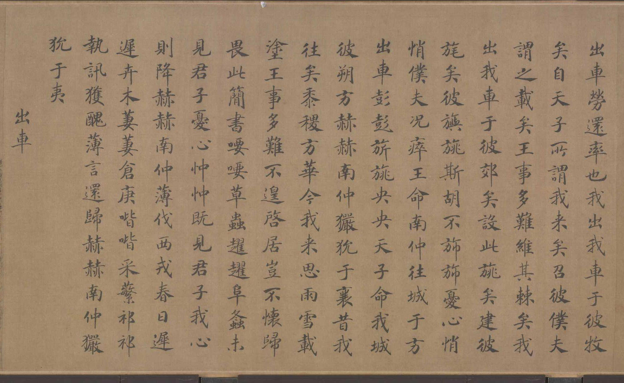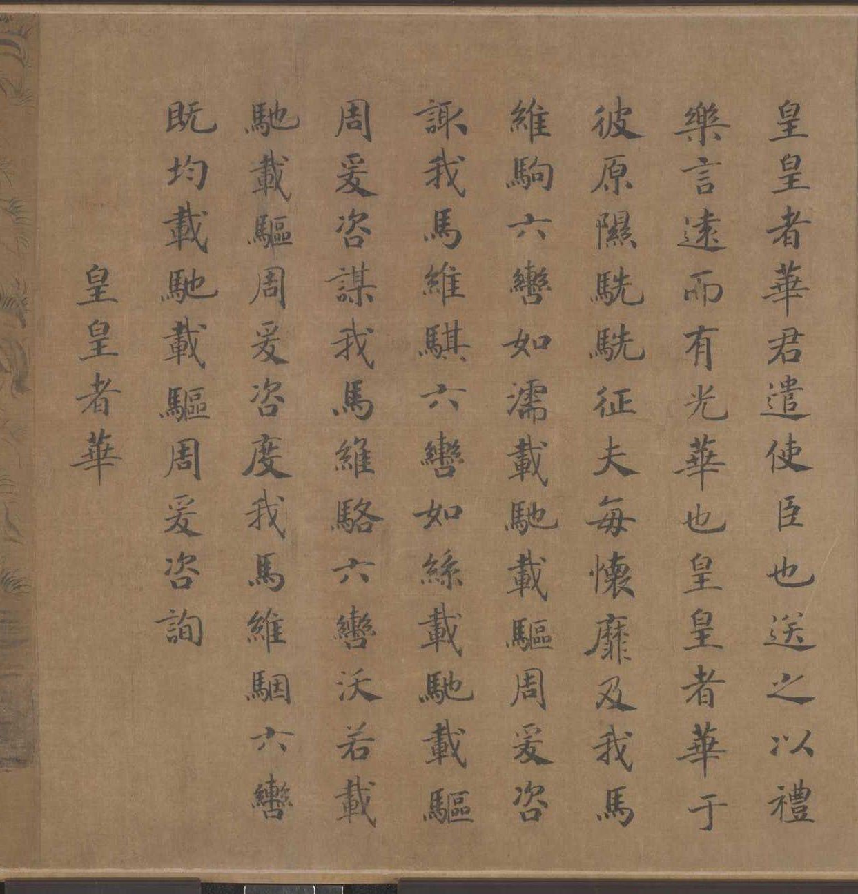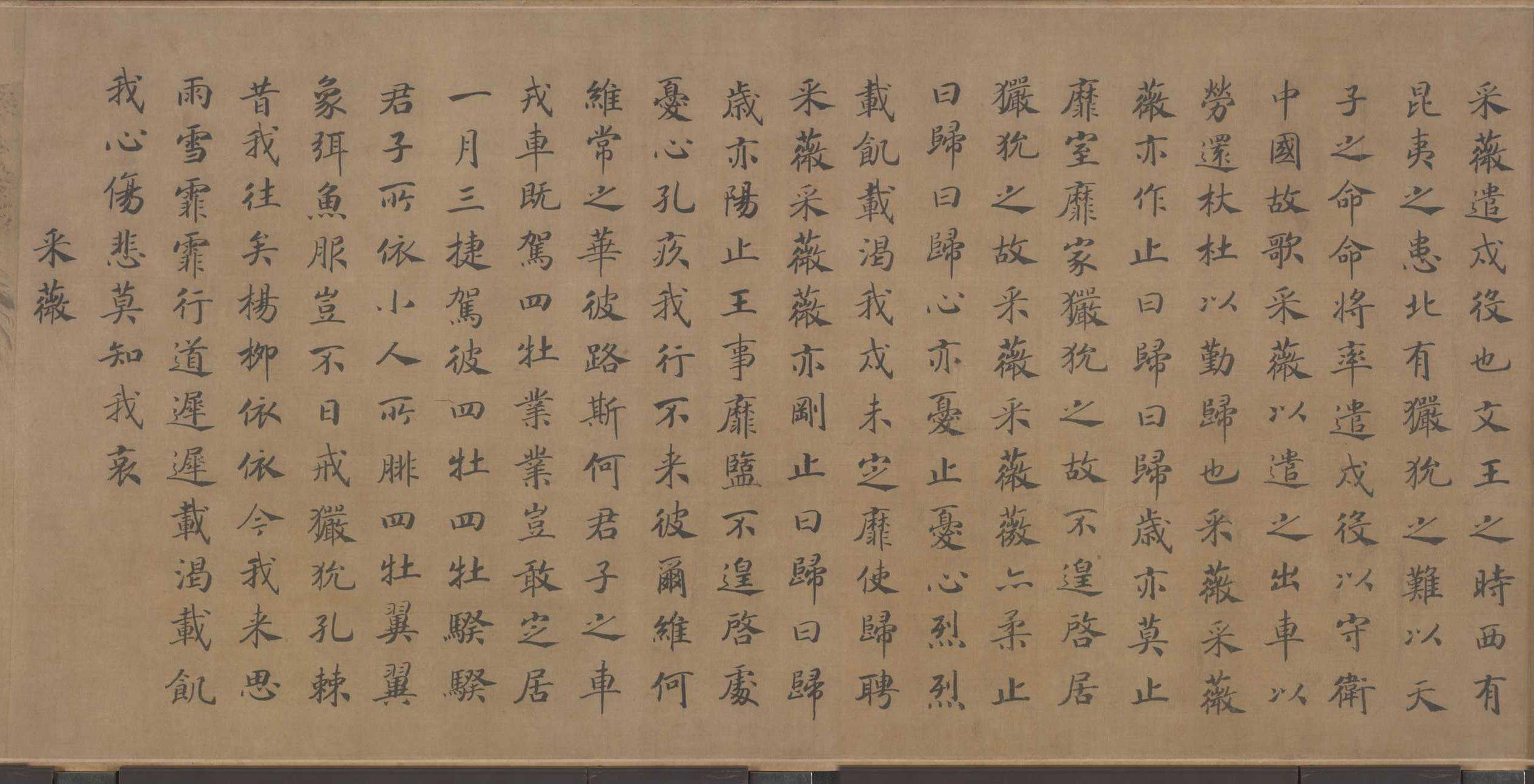 此卷是南宋著名画家马和之创作的《诗经》系列画作品中的一卷。全卷书、画共10段,每段前小楷书《诗经》原文,文后为图。首段开头书“鹿鸣之什”四字,末段书三首诗名及小序,末又书“鹿鸣之什十篇”。