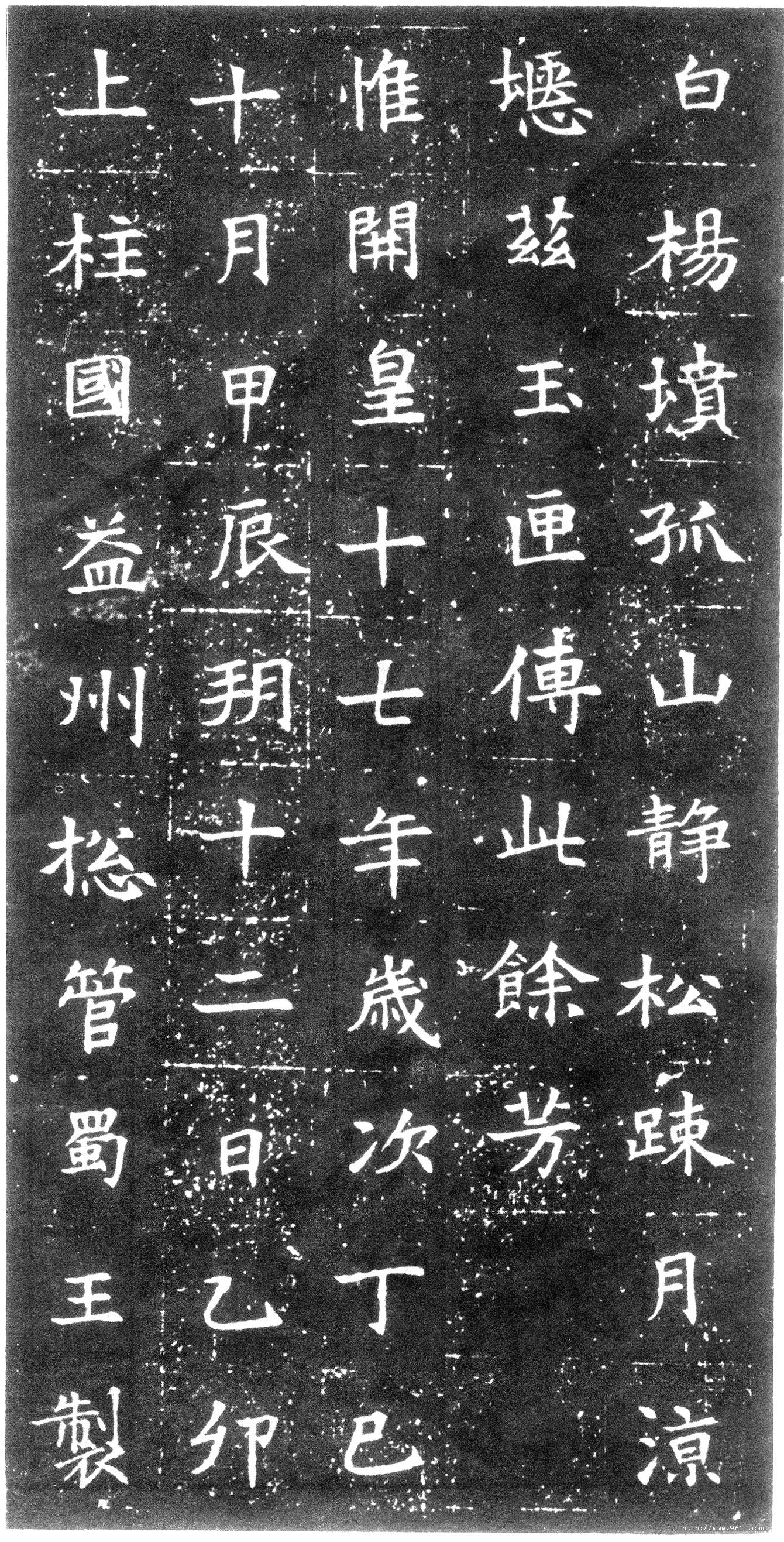 高唐獨絕 陽臺可憐 花耀芳囿 霞綺遙天 波驚洛浦 芝茂瓊田 嗟乎頺日 還隨湲川 比翼孤栖 同心隻寢 風捲愁慔 氷寒淚枕 悠悠長暝 杳杳無春 落鬟 摧櫬 故黛凝塵 昔新悲故 今故悲新 餘心留想 有念無人 去歲花臺 臨歡陪踐 今茲秋夜 思人潛泫 *(辶子)神真宅 歸骨雲房 依依泉路 蕭蕭白楊 孤墳山靜 松疏 月涼 *(土上匧下心)茲玉匣 傳此餘芳 惟開皇十七年歲次丁卯十月甲辰朔十二日乙卯 上柱國益州摠管屬王製