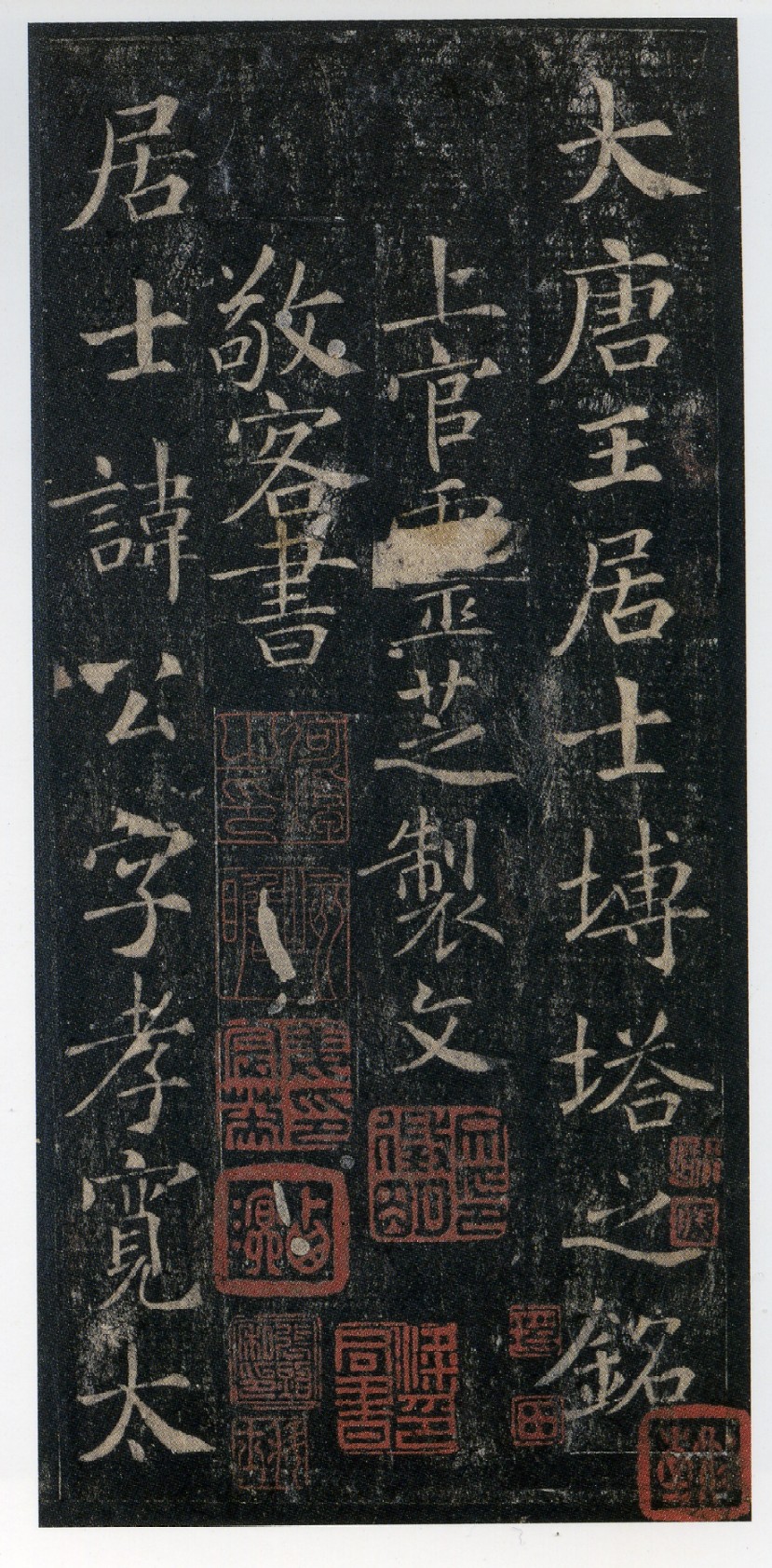 《王居士砖塔铭》又称《王孝宽铭》,全称《大唐王居士砖塔之铭》,唐上官灵芝撰文,敬客书。唐显庆三年(658)十月二十六日入窆,明万历年间出土于西安城南百塔寺。共有楷书 17 行,每行 17 字,刻于方砖之上,出土时已裂为三块,继而裂为五块、七块,又佚二块。因椎拓过多,保护不力,原砖出土不久即碎完,残石现存陕西合阳文化馆。幸存全拓本流传于世。此塔铭与褚遂良字体有神似之处,然不乏端凝,结体既端庄方正,又丰泽秀润;笔法上轻重得当,可以说融冶众长,别出新意。明清诸家评论甚多,如王澍、毛凤枝,至叶昌炽《语石》尤为推重,有“今世所珍者,莫如《砖塔铭》”之评。