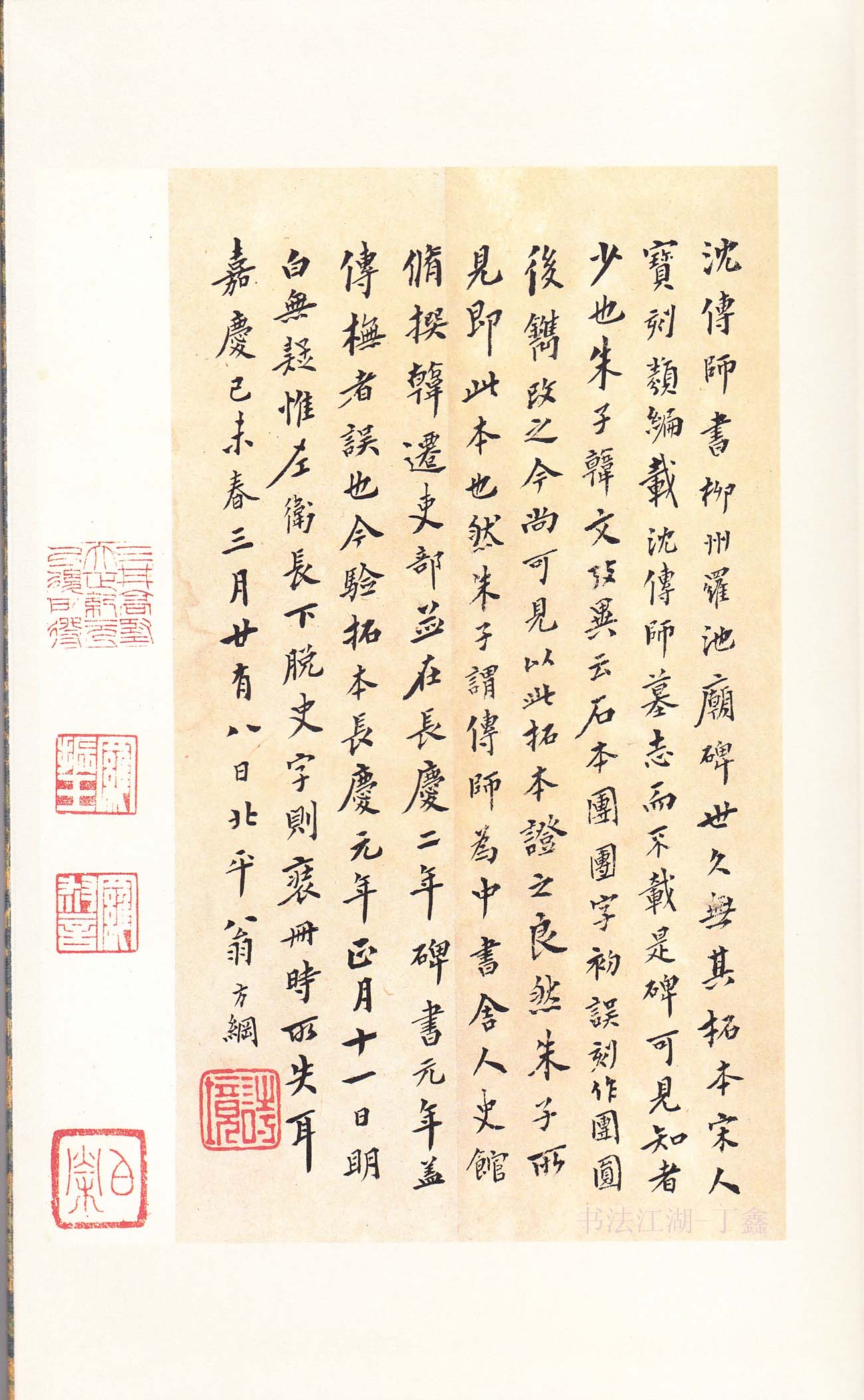 《柳州罗池庙碑》为沈传师53岁时所书,碑文由大文学家韩愈撰写,纪念颂扬柳宗元被贬任柳州刺史所做的政绩。碑立于罗池庙内,碑石早已不存,至于何年遭毁,现无从查考,今所见拓本乃据清何绍基旧藏宋拓孤本一册影印。