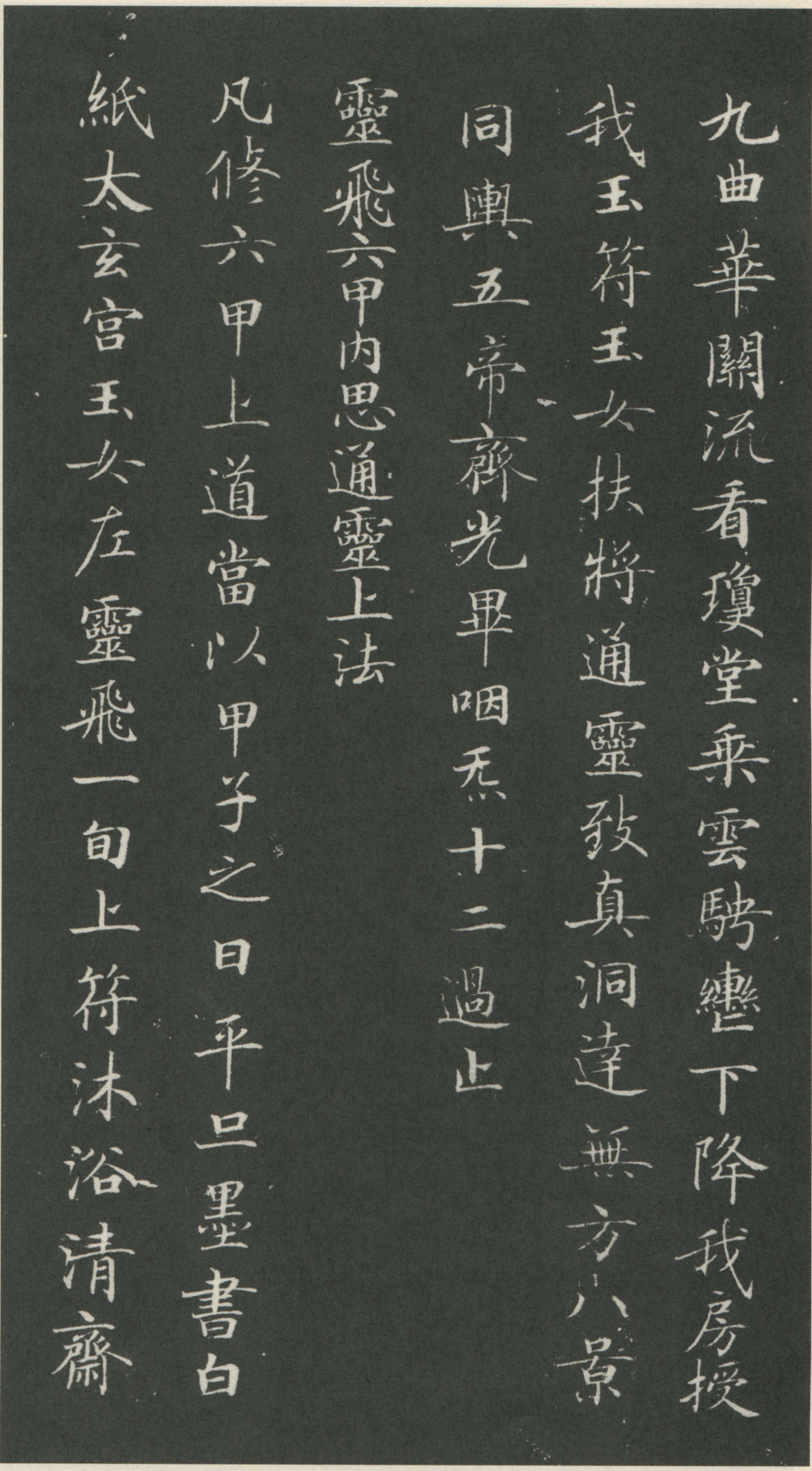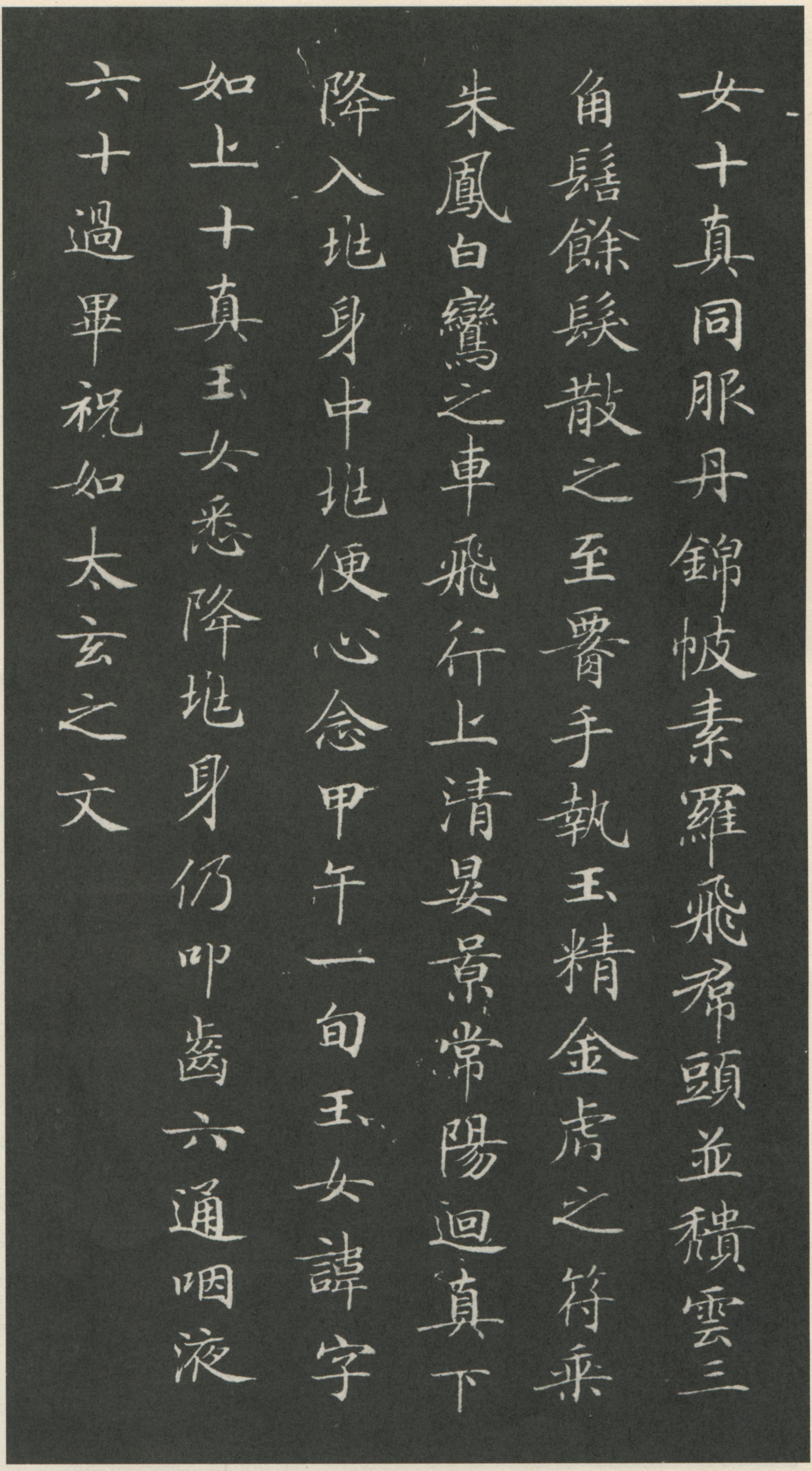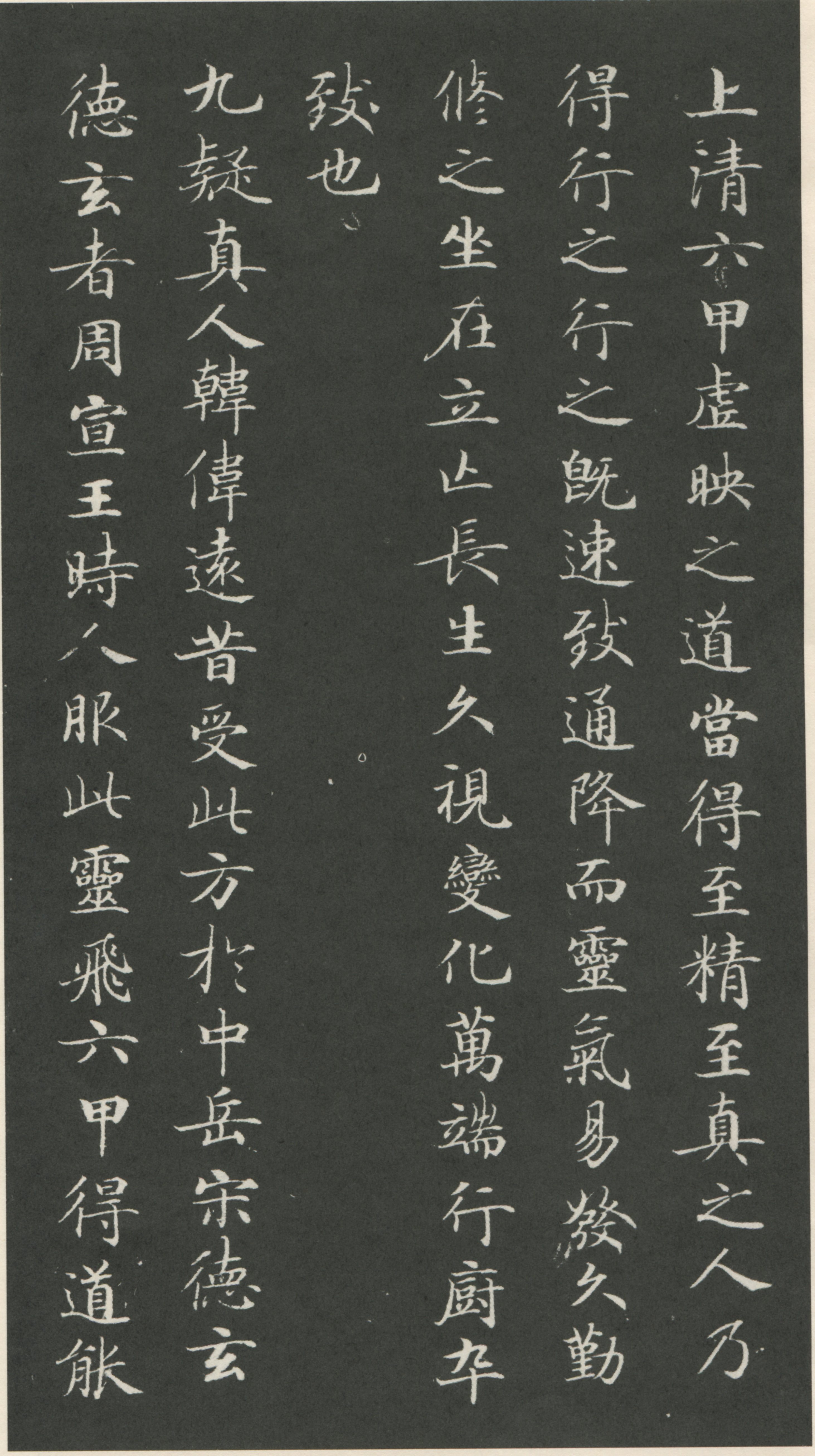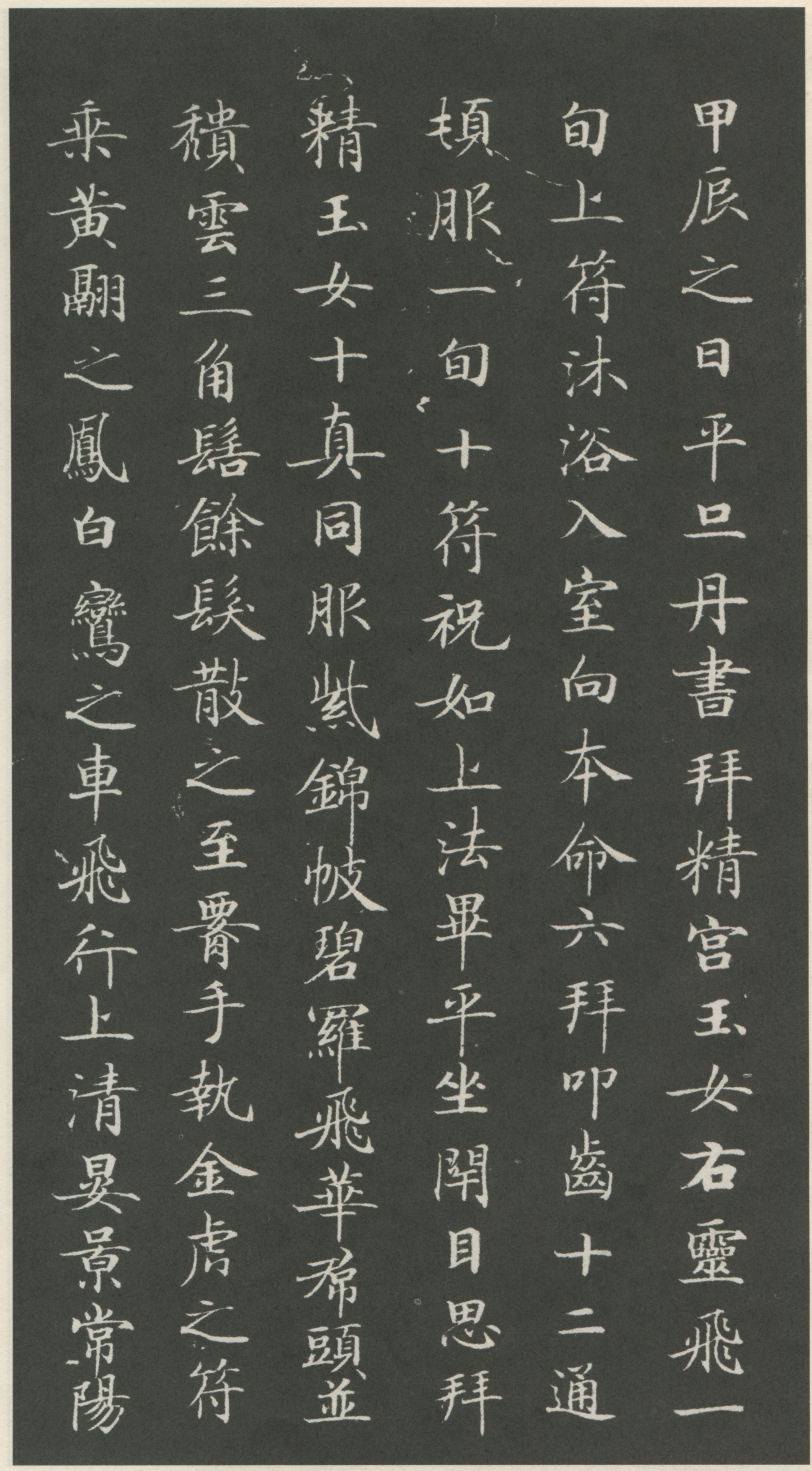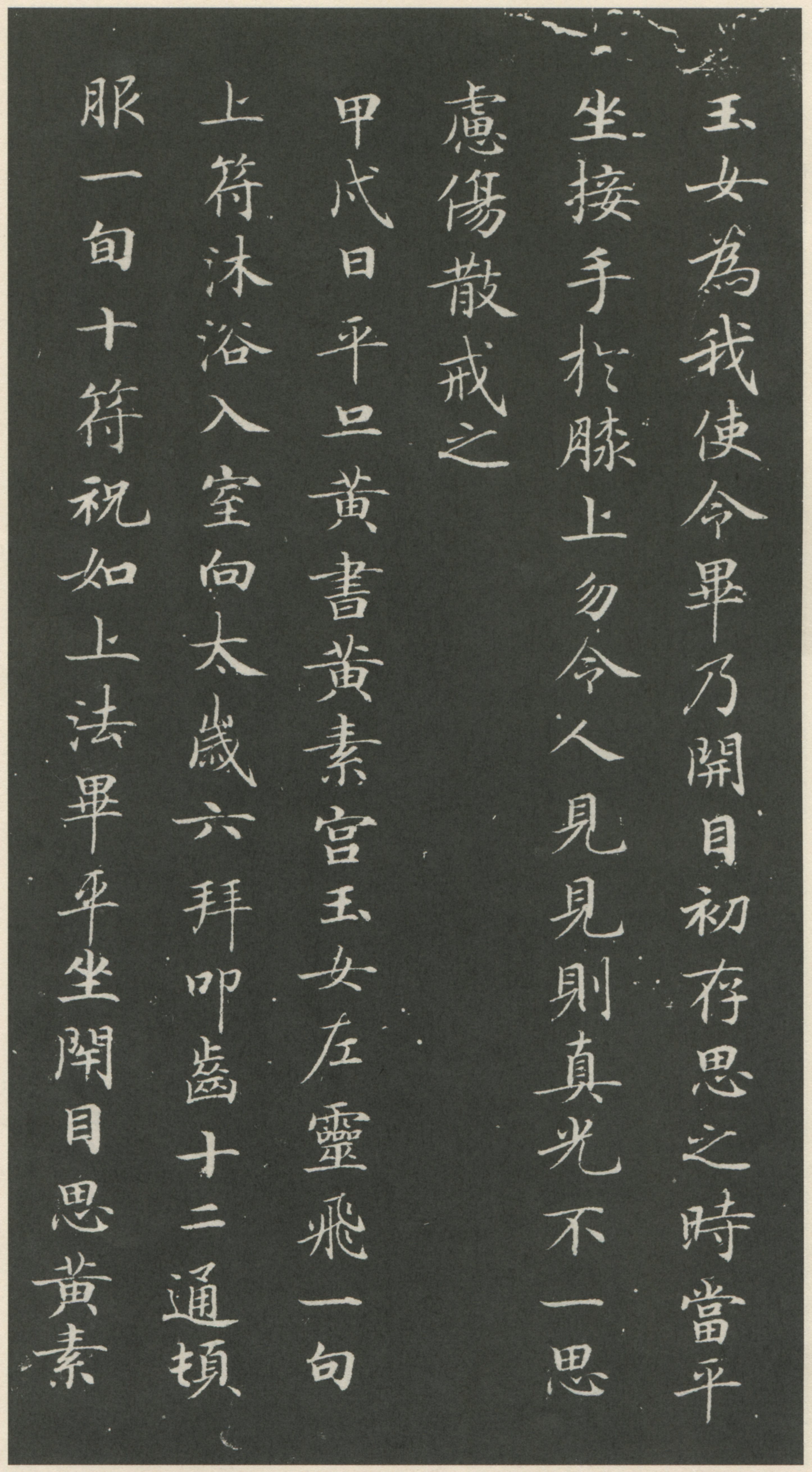 原帖以质地细腻而坚硬的太湖石精细打磨后刻制,《灵飞经》一册共用长70厘米左右,高30厘米左右的条石7条,每条刻5页,每页6行,除《灵飞经》书法本身外,还附刻董其昌后跋3段,计5页半,共计全册35页⑨。据张彦生先生《善本碑帖录》记载,最初拓本完好无损,稍后拓本12页第三行首字“朱兵”之“朱”字裂一线,清初拓本第5页第2行中“斋室”二字破损,一般以“斋室”二字不损者为初拓。据王壮弘《帖学举要》所载:清初拓本董其昌跋“十五年”行与“戊戌冬”行之间无直裂泐痕;乾嘉拓本,经文后段下方尚无乱刀痕;道光以后拓本后段下方有乱刀痕18条,世称“十八刀本”,其时由于椎拓过多,字口已经比较模糊。