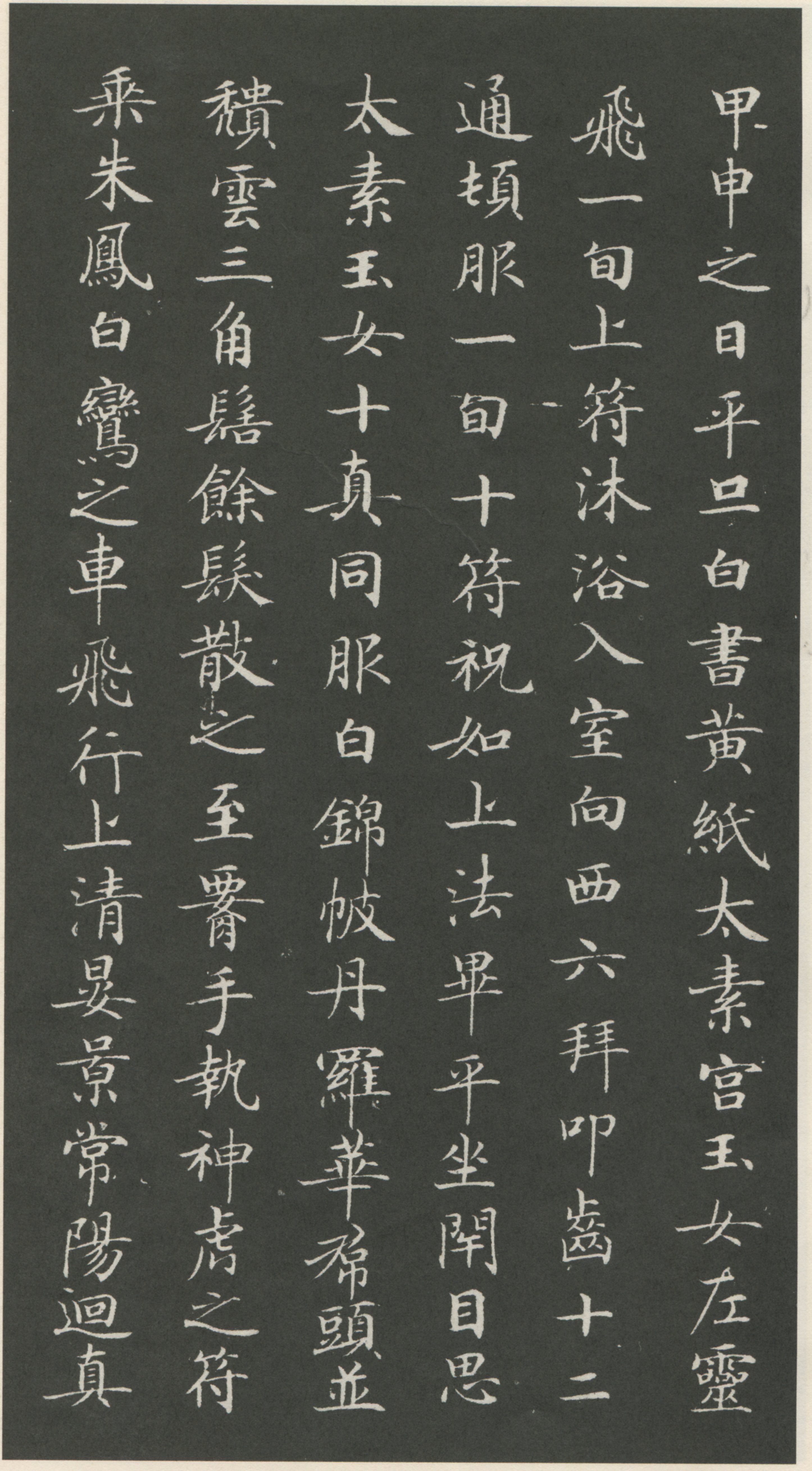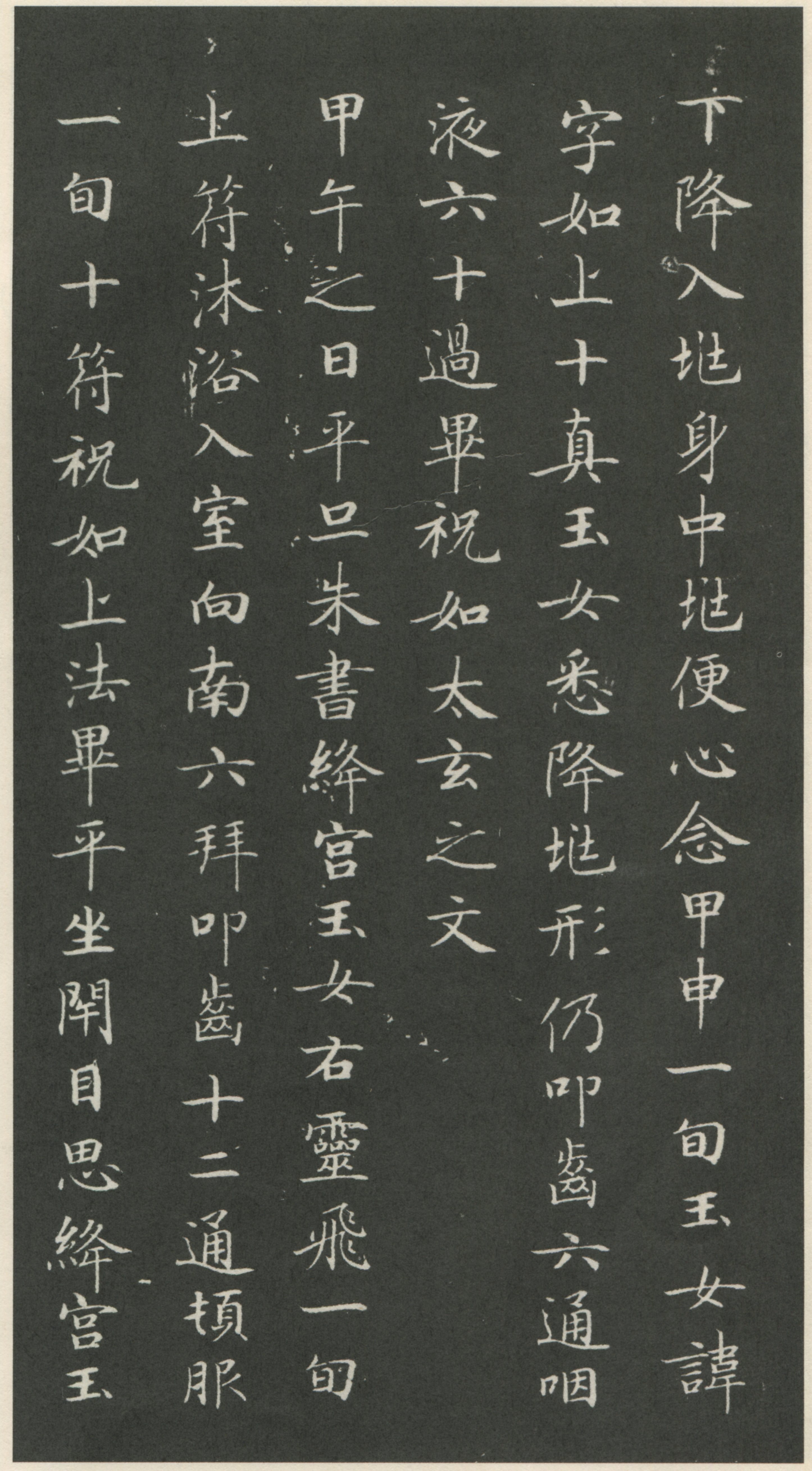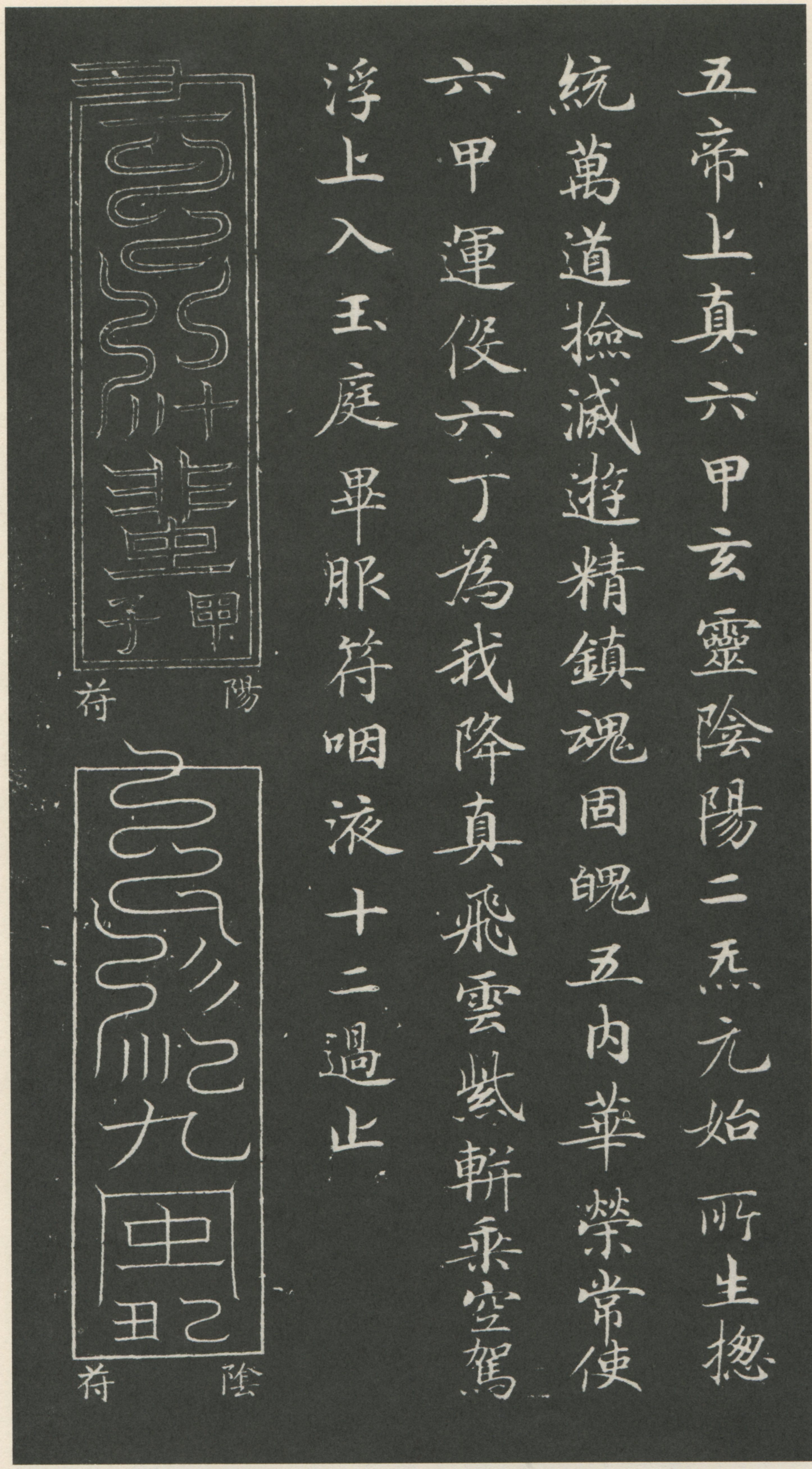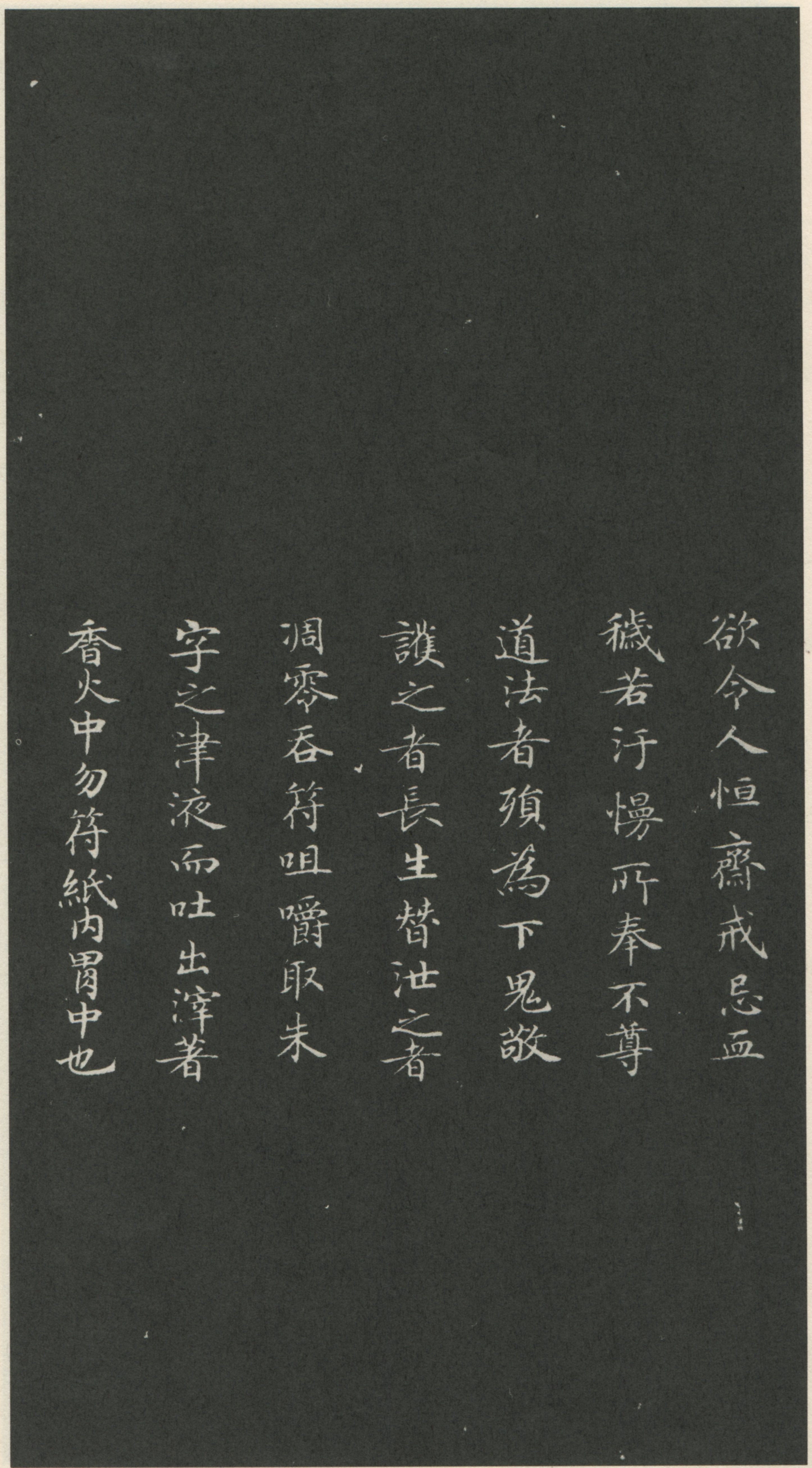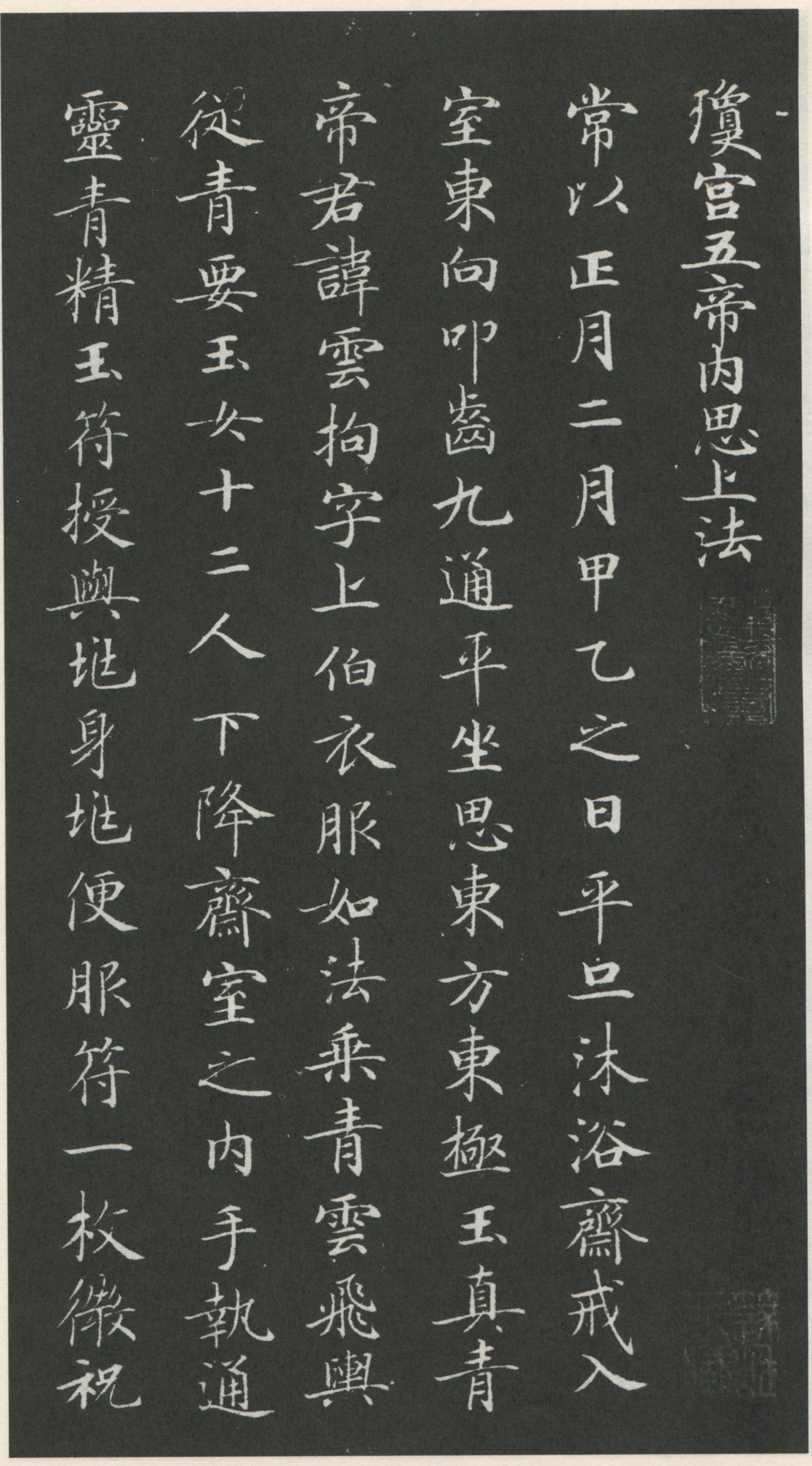 原帖以质地细腻而坚硬的太湖石精细打磨后刻制,《灵飞经》一册共用长70厘米左右,高30厘米左右的条石7条,每条刻5页,每页6行,除《灵飞经》书法本身外,还附刻董其昌后跋3段,计5页半,共计全册35页⑨。据张彦生先生《善本碑帖录》记载,最初拓本完好无损,稍后拓本12页第三行首字“朱兵”之“朱”字裂一线,清初拓本第5页第2行中“斋室”二字破损,一般以“斋室”二字不损者为初拓。据王壮弘《帖学举要》所载:清初拓本董其昌跋“十五年”行与“戊戌冬”行之间无直裂泐痕;乾嘉拓本,经文后段下方尚无乱刀痕;道光以后拓本后段下方有乱刀痕18条,世称“十八刀本”,其时由于椎拓过多,字口已经比较模糊。