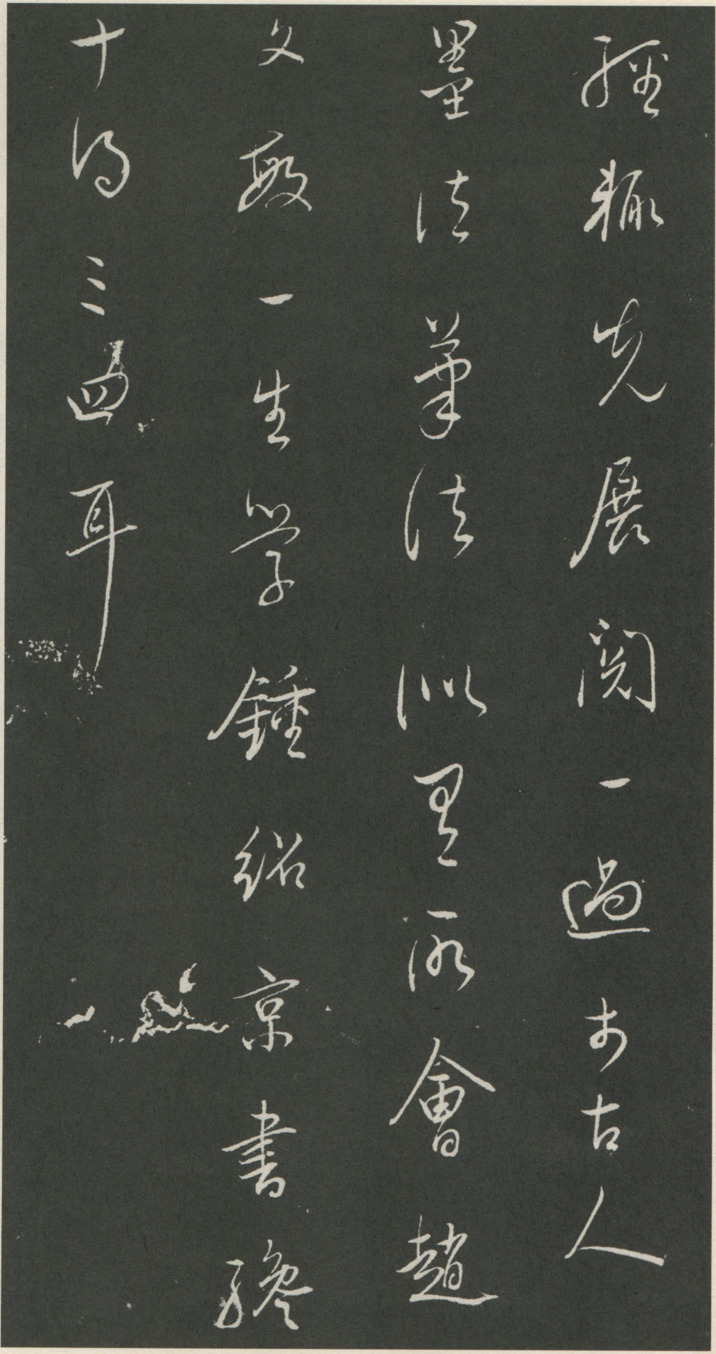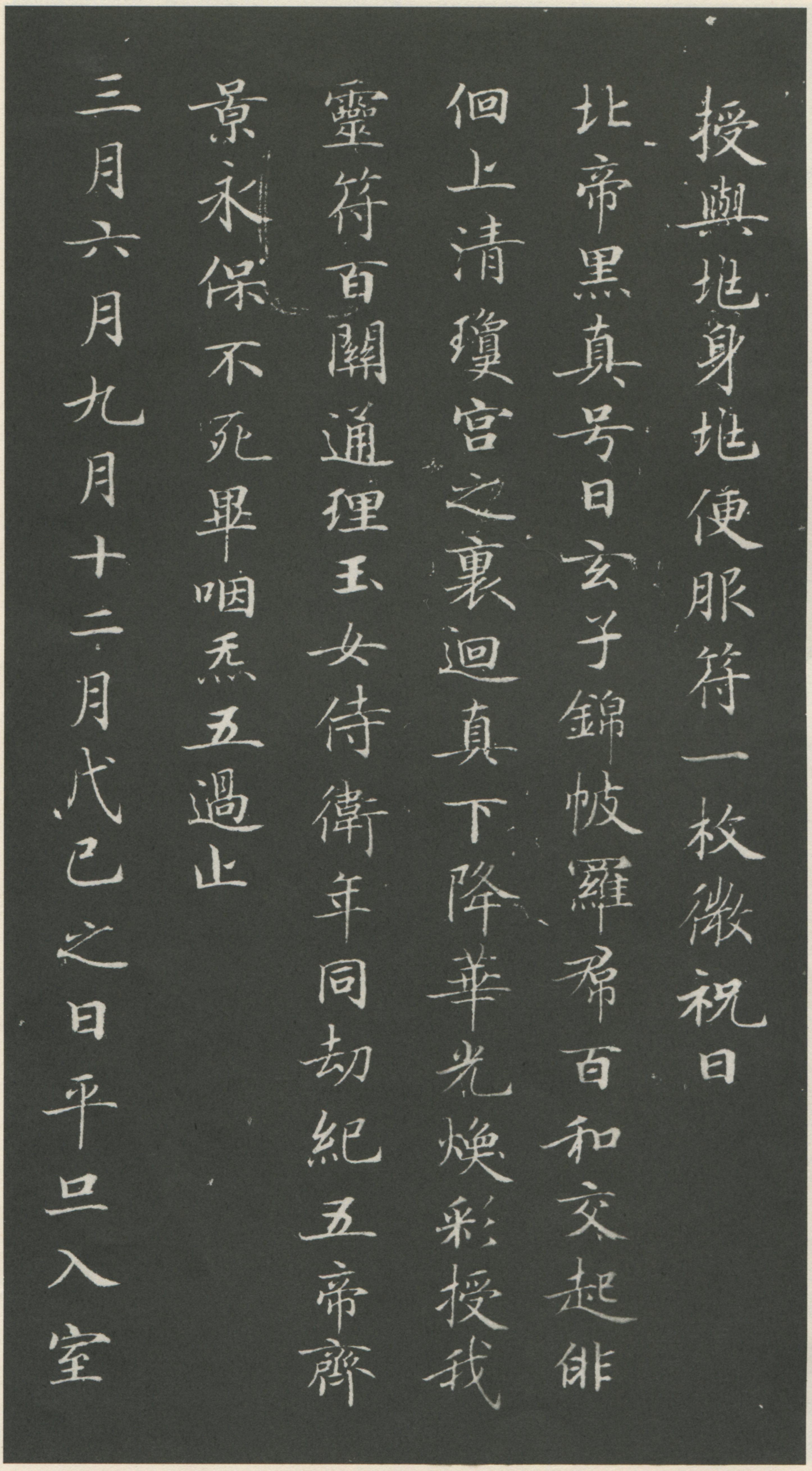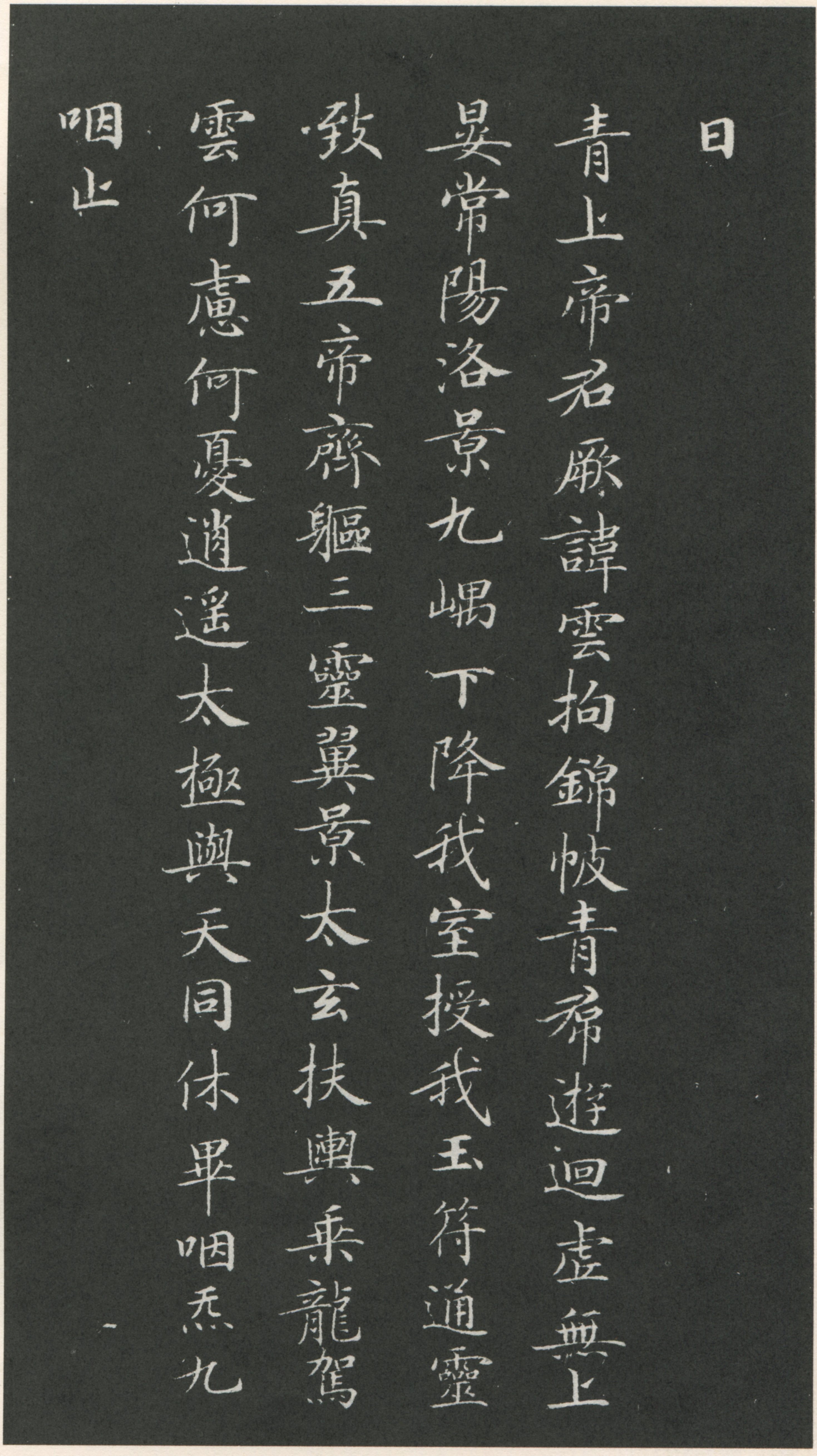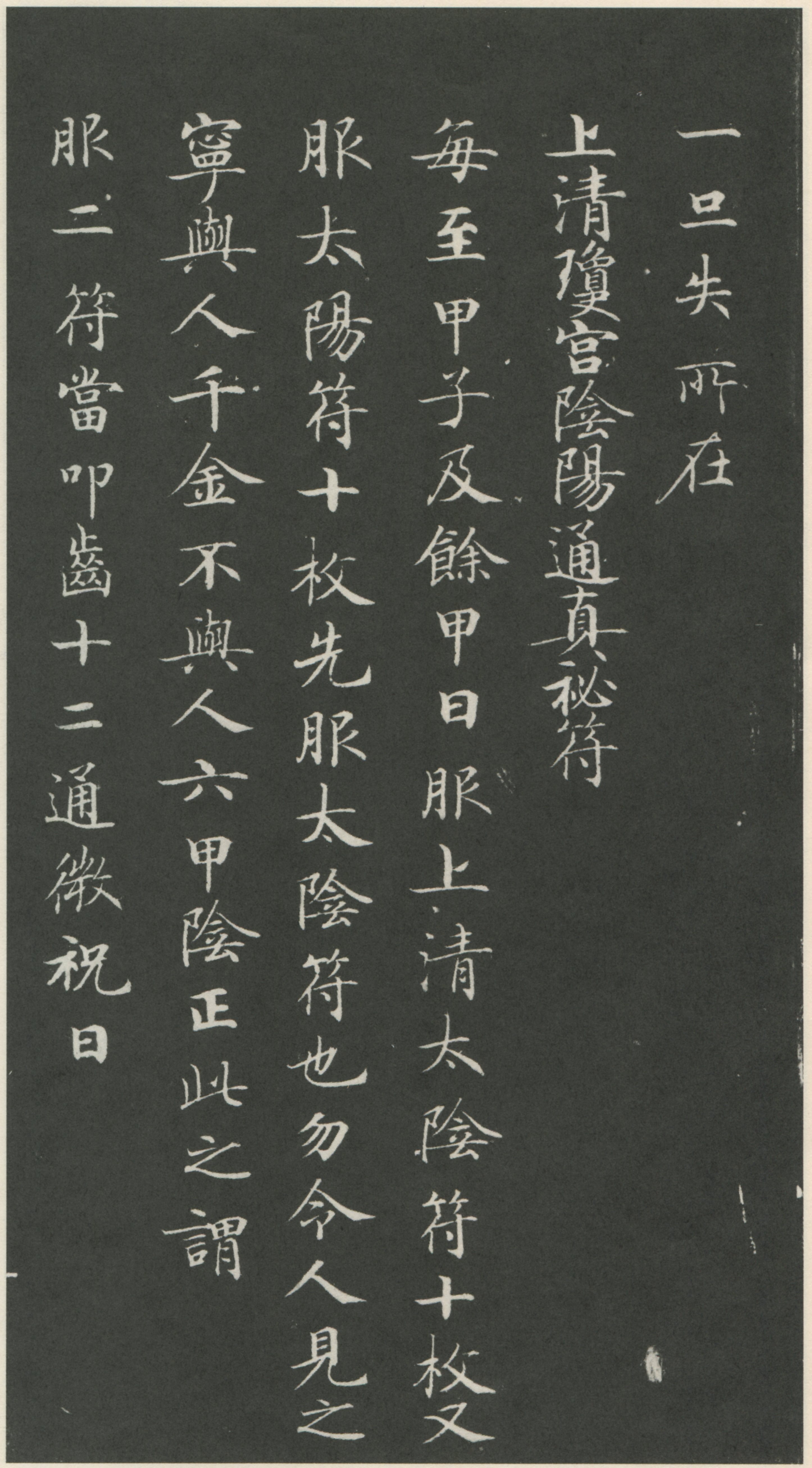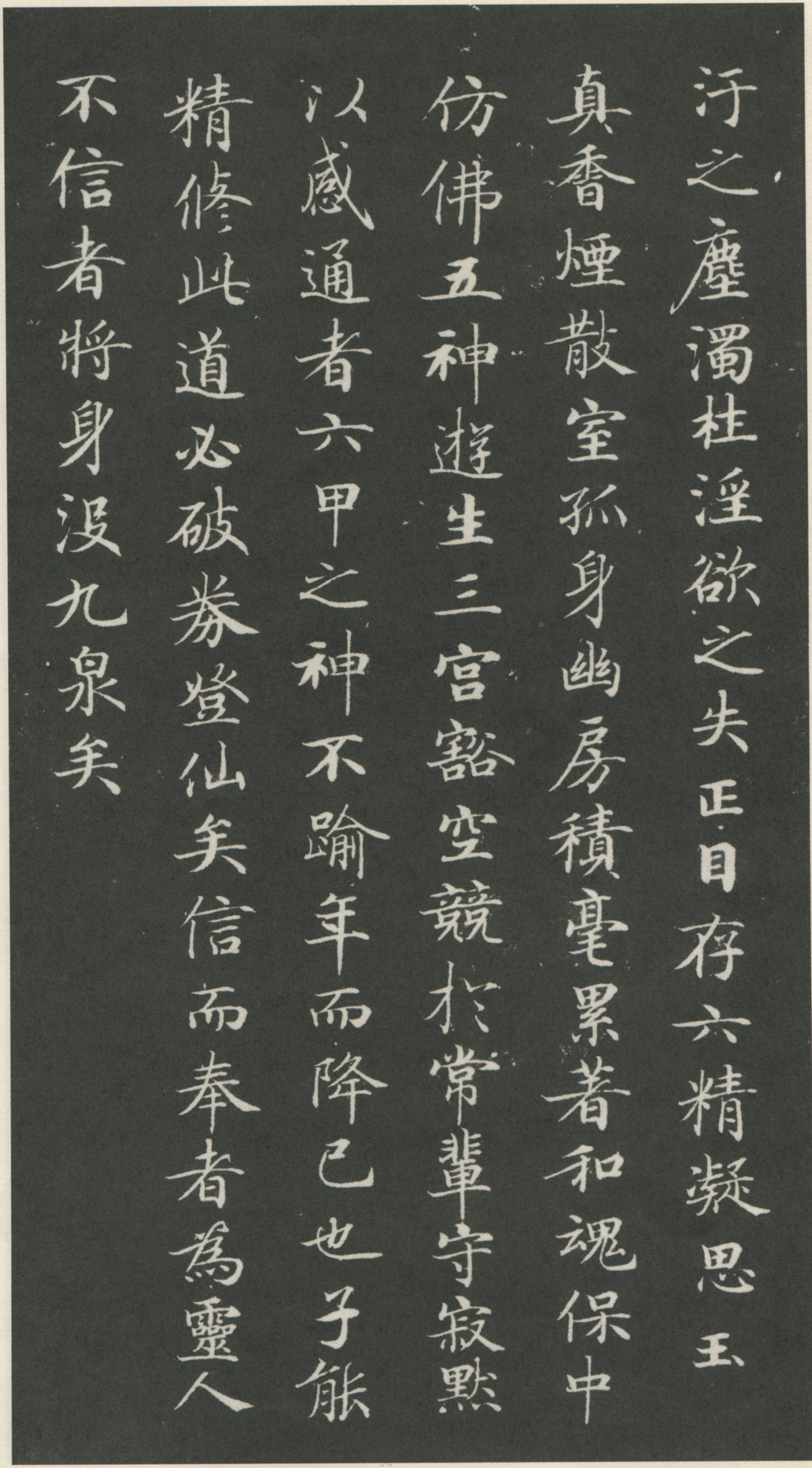 原帖以质地细腻而坚硬的太湖石精细打磨后刻制,《灵飞经》一册共用长70厘米左右,高30厘米左右的条石7条,每条刻5页,每页6行,除《灵飞经》书法本身外,还附刻董其昌后跋3段,计5页半,共计全册35页⑨。据张彦生先生《善本碑帖录》记载,最初拓本完好无损,稍后拓本12页第三行首字“朱兵”之“朱”字裂一线,清初拓本第5页第2行中“斋室”二字破损,一般以“斋室”二字不损者为初拓。据王壮弘《帖学举要》所载:清初拓本董其昌跋“十五年”行与“戊戌冬”行之间无直裂泐痕;乾嘉拓本,经文后段下方尚无乱刀痕;道光以后拓本后段下方有乱刀痕18条,世称“十八刀本”,其时由于椎拓过多,字口已经比较模糊。
