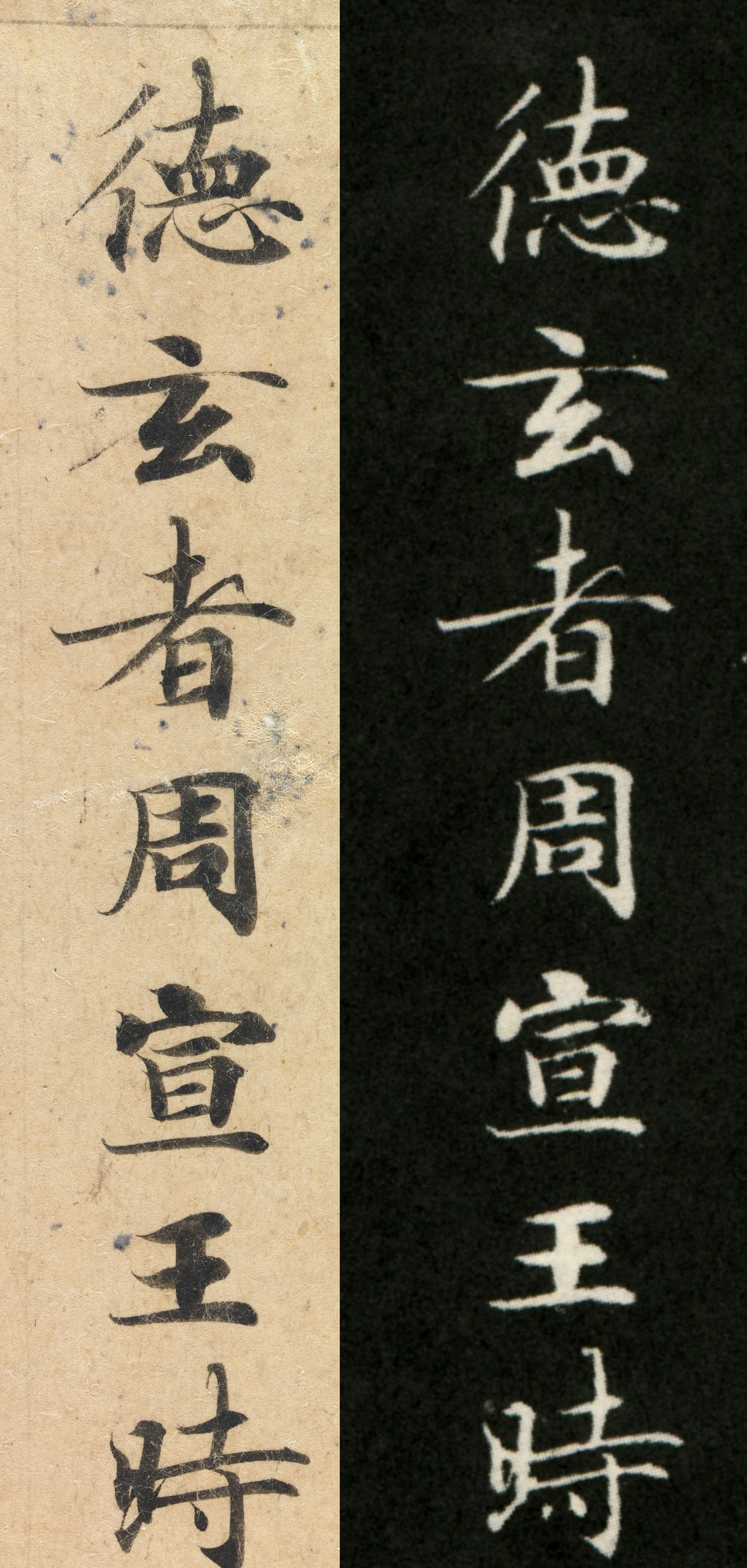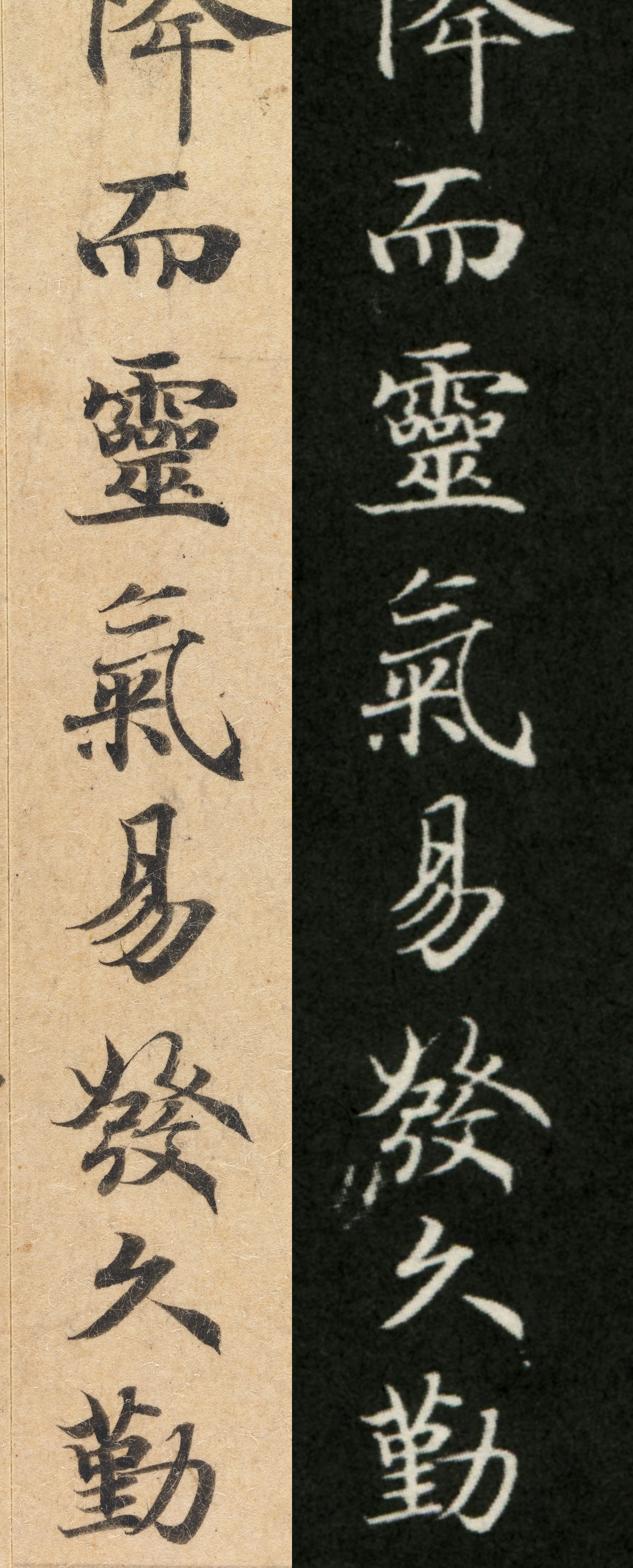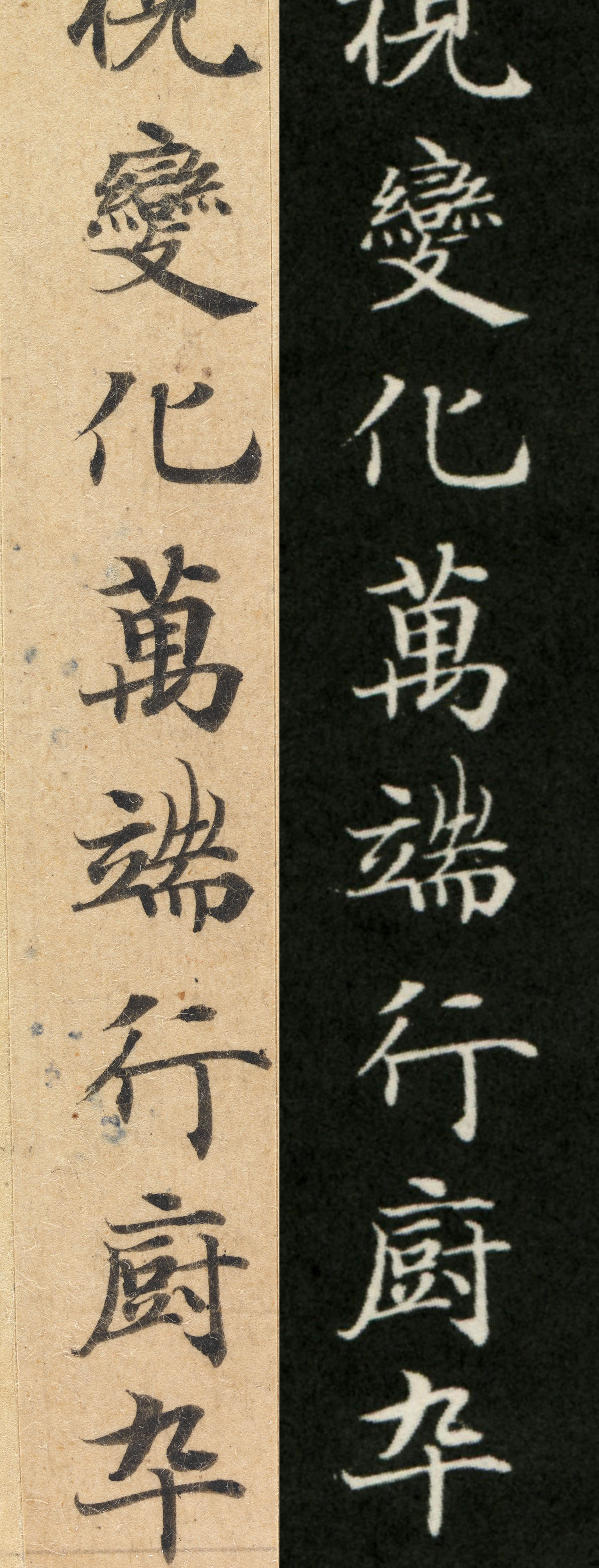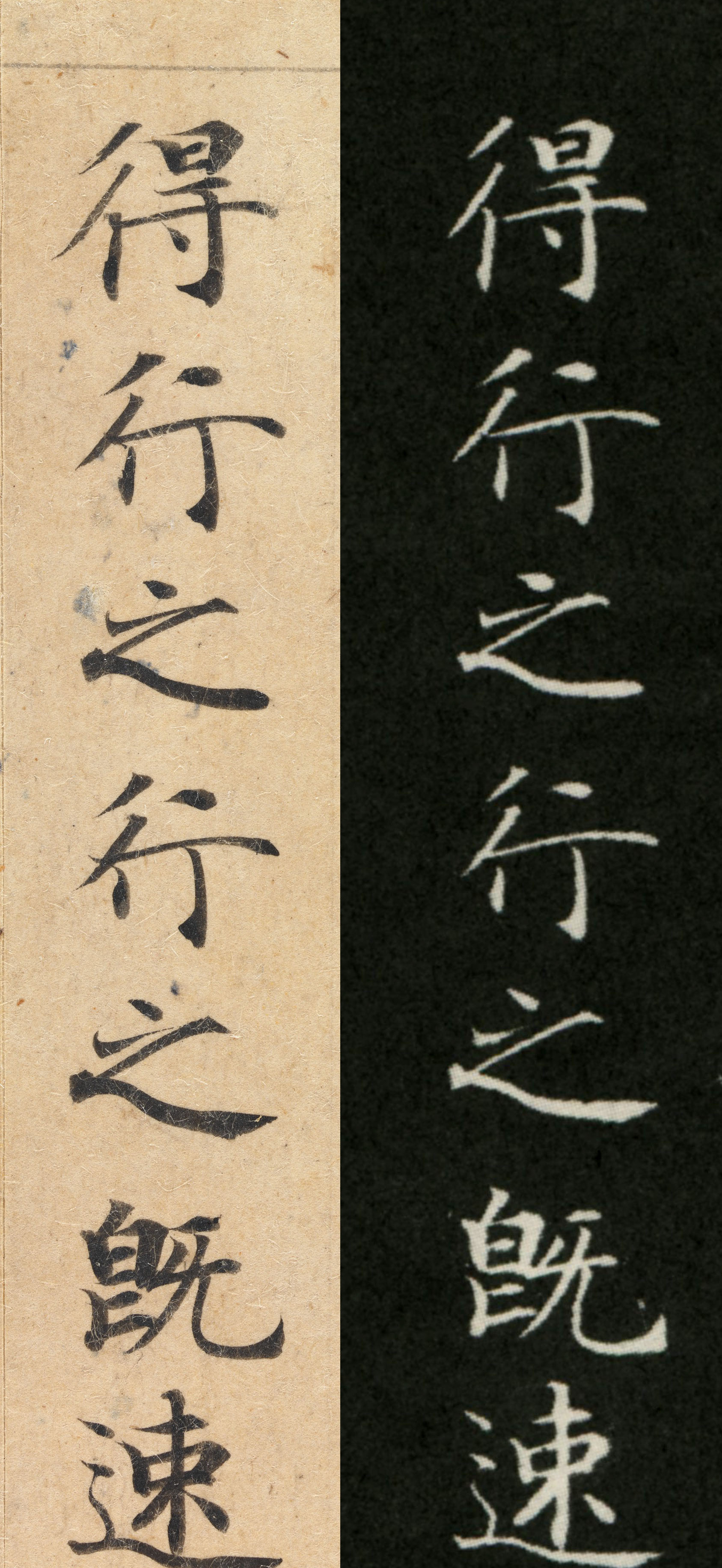 之所以如此,与《灵飞经》的写经性质有关。墨迹固然鲜活生动,但其中的牵丝映带,偶尔可见一定习气;渤海本刻工并未完全忠于原帖,而是在刻制中做了一定减省,抹去习气,这个碑刻反倒显得古朴清秀。