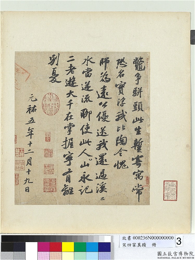释文:辩才老师。退居龙井。不復出入。軾往见之。常出至风篁岭。左右惊曰。远公復过虎。(闕。据东坡集。此行当為溪矣二字)。辩才笑曰。杜子美不云乎。与子成二老。来往亦风流。因作亭岭上。名之曰过溪。亦曰二老。谨次辩才韵。赋诗一首。眉山苏軾上。 日月转双轂。古今同一丘。惟此鹤骨老。凛然不知秋。去住两无碍。天人争挽留。去如龙出□。(□当為山)。雷雨卷潭湫。来如珠还浦。鱼鳖争駢头。此生蹔寄寓。常恐名实浮。我比陶令愧。师為远公优。送我还过溪。溪水当逆流。聊使此山人。永记二老游。大千在掌握。寧有离别忧。元祐五年(1090)十二月十九日。【资料参考】台北故宫博物院(故-書-000236-00002)