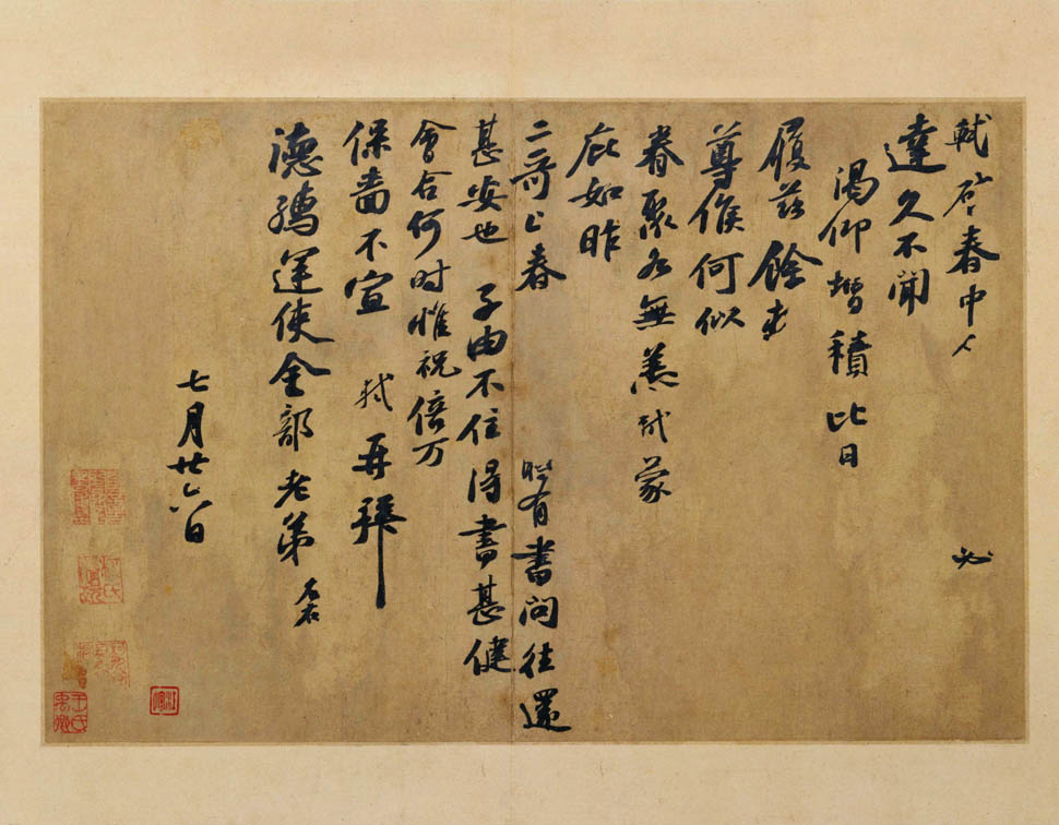 轼启。春中□□□□达,久不闻□渴仰增积。比日履兹馀□尊候何似,眷聚各无恙。轼蒙庇如昨。二哥□,春□□□有书问往还,甚安也。子由不住得书,甚健。会合何时,惟祝倍万保啬,不宣。轼再拜。德孺运使金部老弟左右。七月廿六日。