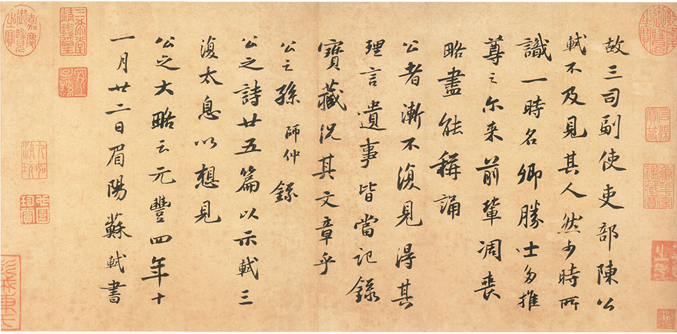 此帖自署书于元丰四年(1081)。题跋一则。13行,计106字。为吏部陈公诗题跋。?“吏部陈公”乃陈洎,宋彭城人,字亚之。皇祐中官司三司监铁副使。著有《陈副使诗》。